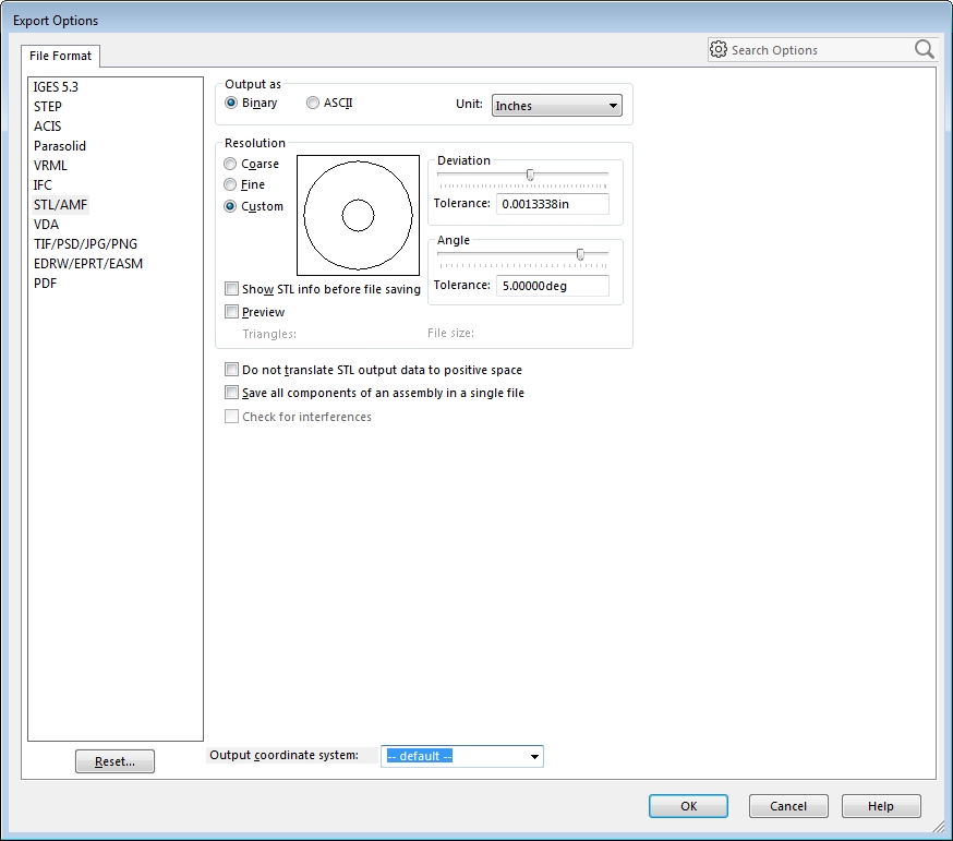 In the CAD package, when exporting to STL, you may see parameters for chord height, deviation, angle tolerance, or something similar. These are the parameters that affect the faceting of the STL.You don’t necessarily want to go too small. The finer the STL the larger the file is in size, which will affect processing time in Insight as well as build time. Below is some information found on the Internet regarding exporting to STL from various CAD packages.