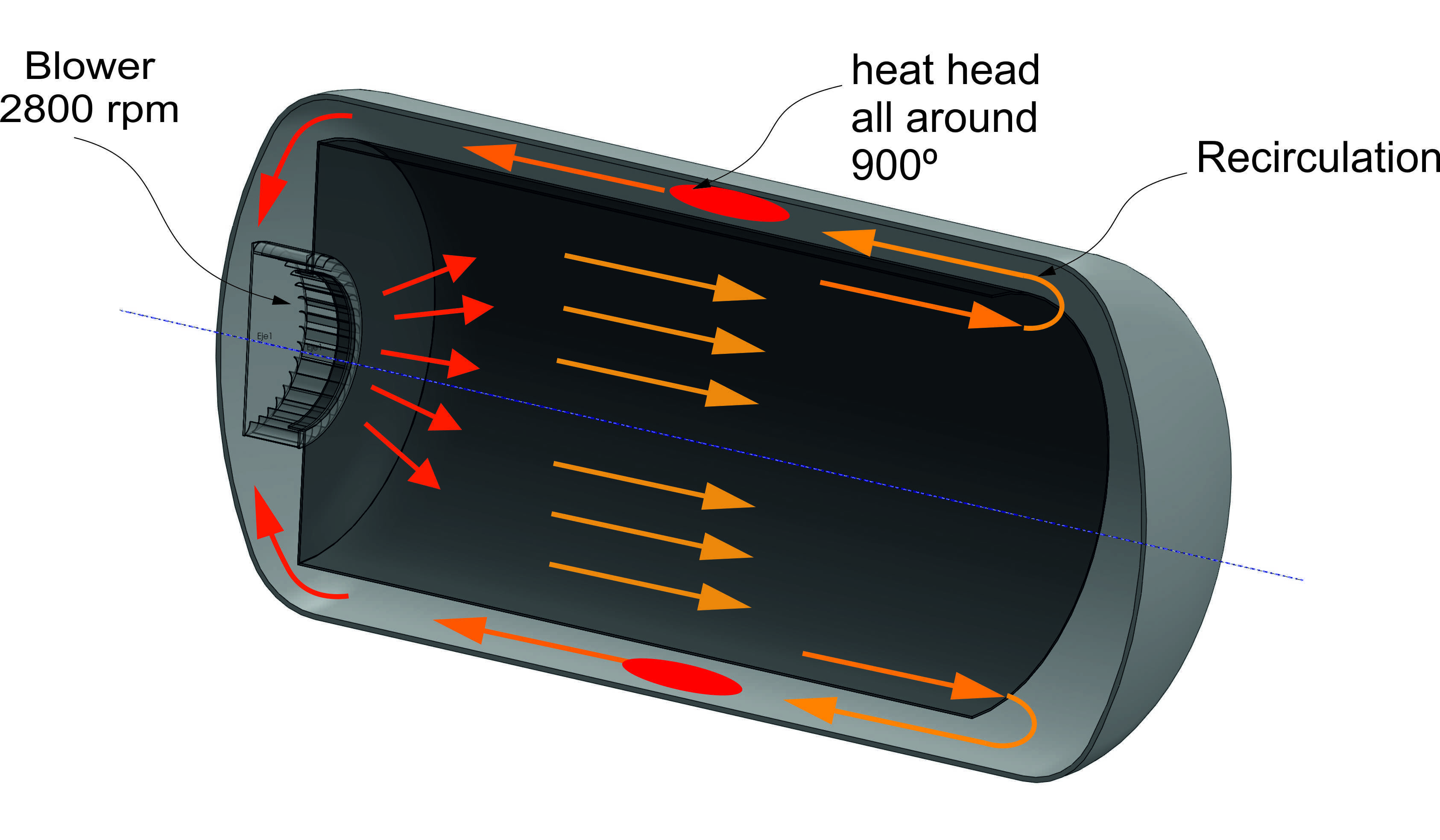 Necesito crear una recirculacion de flujo para un recipiente, en la recirculacion existen resistencias que calientan el aire, la turbina impulsa el aire caliente al interior de la cámara, para luego ingresarla a la misma cámara, el recipiente es un Autoclave a presion de 5 bar