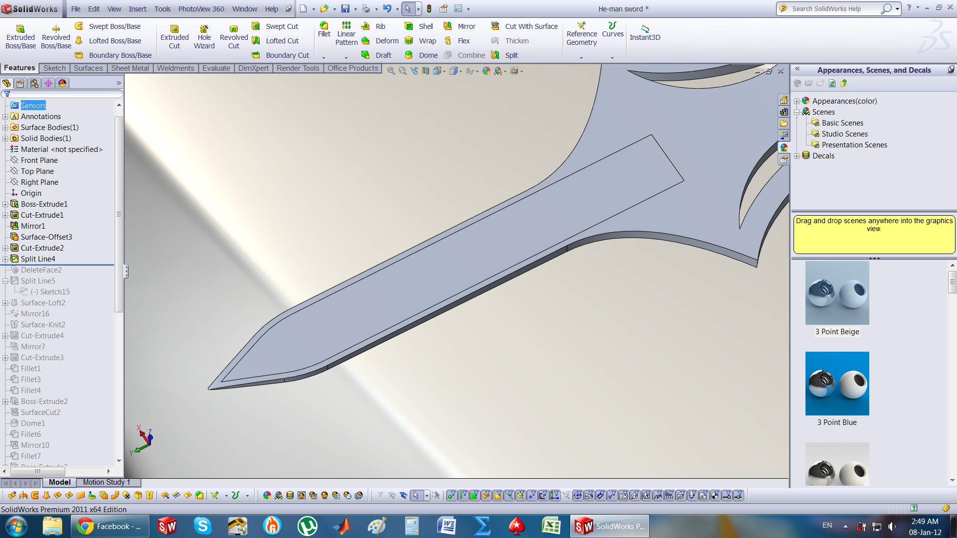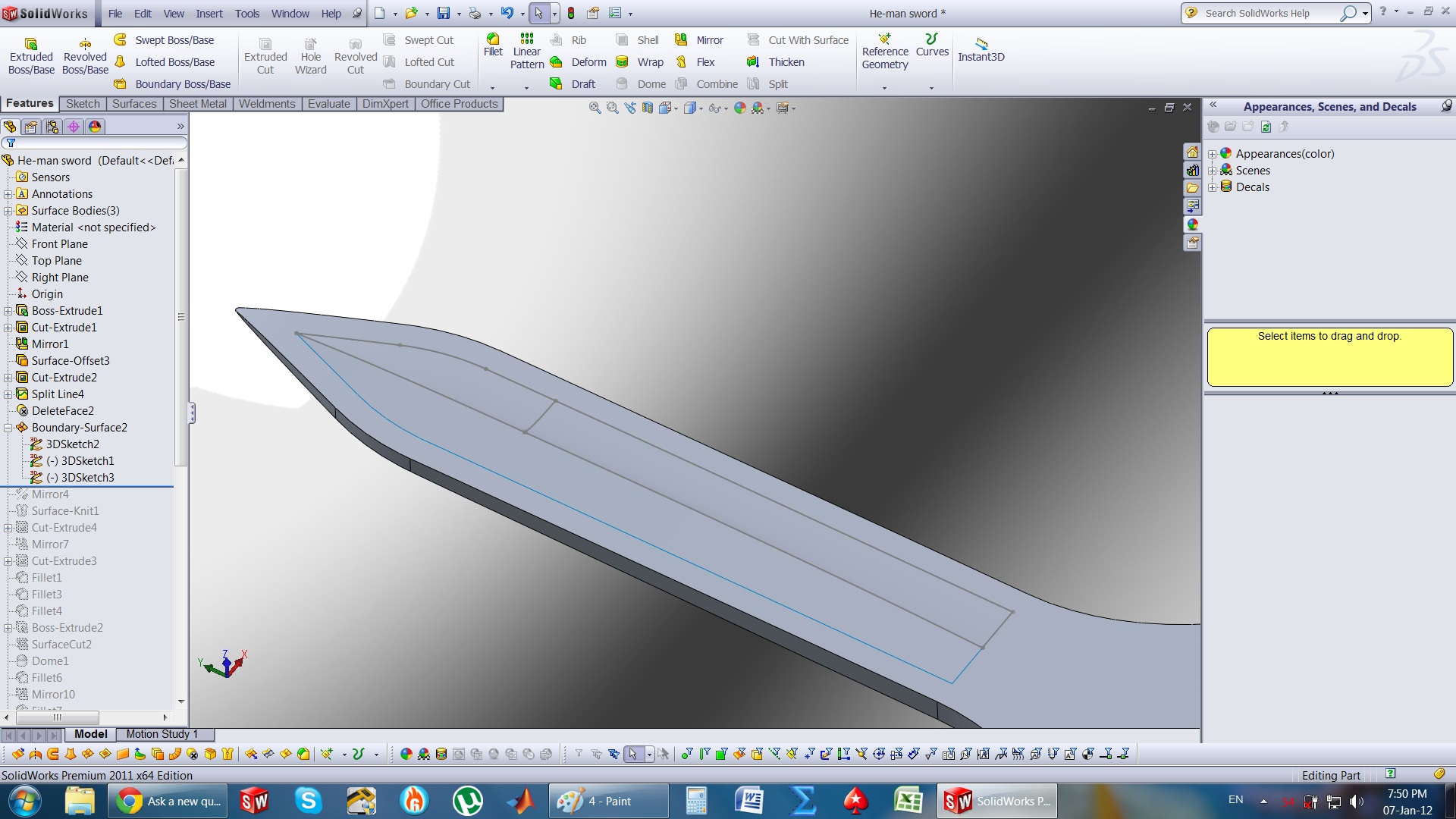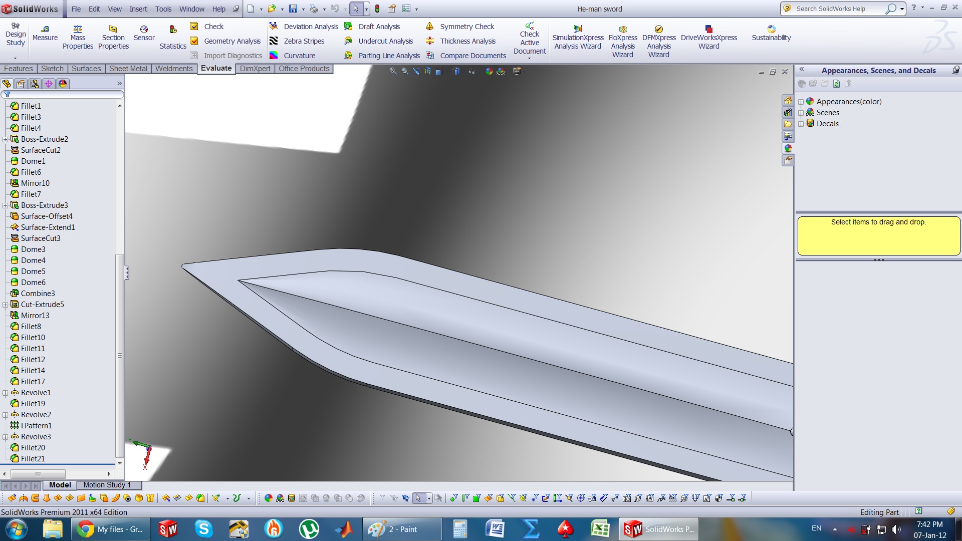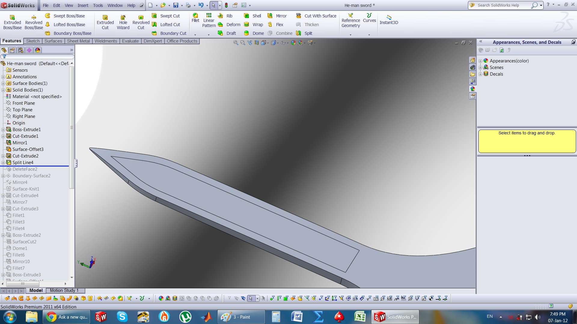 I think that you can't get any better than this unless you move the boundaries of the sketch for the rib all the way to the edge of the main solid part on which you created the sketch. That way, the line that appears at the end of the fillet would be collinear with the edge of the sword. Since I can't open the file (I'm still with SW2010) I can suggest another method of creation, and that would mean drawing the profile of the sword at the handle and extrusion into length, and instead of using a parallelogram and editing it with a fillet, use a spline (one quarter of the profile and use mirror to get the left/right and then, again a mirror to get the other half, extrude to desired length and at the tip, do a drawing of the swords tip shape and cut-extrude... That leads to the small problem with the tip itself and the third approach is to create the main body of the blade, do a spline drawing at one end (@ handle) and draw a line around the whole blade to act as a path for a swept cut. That would probably be the best. I made a quick example of the spline based creation of the sword blade.