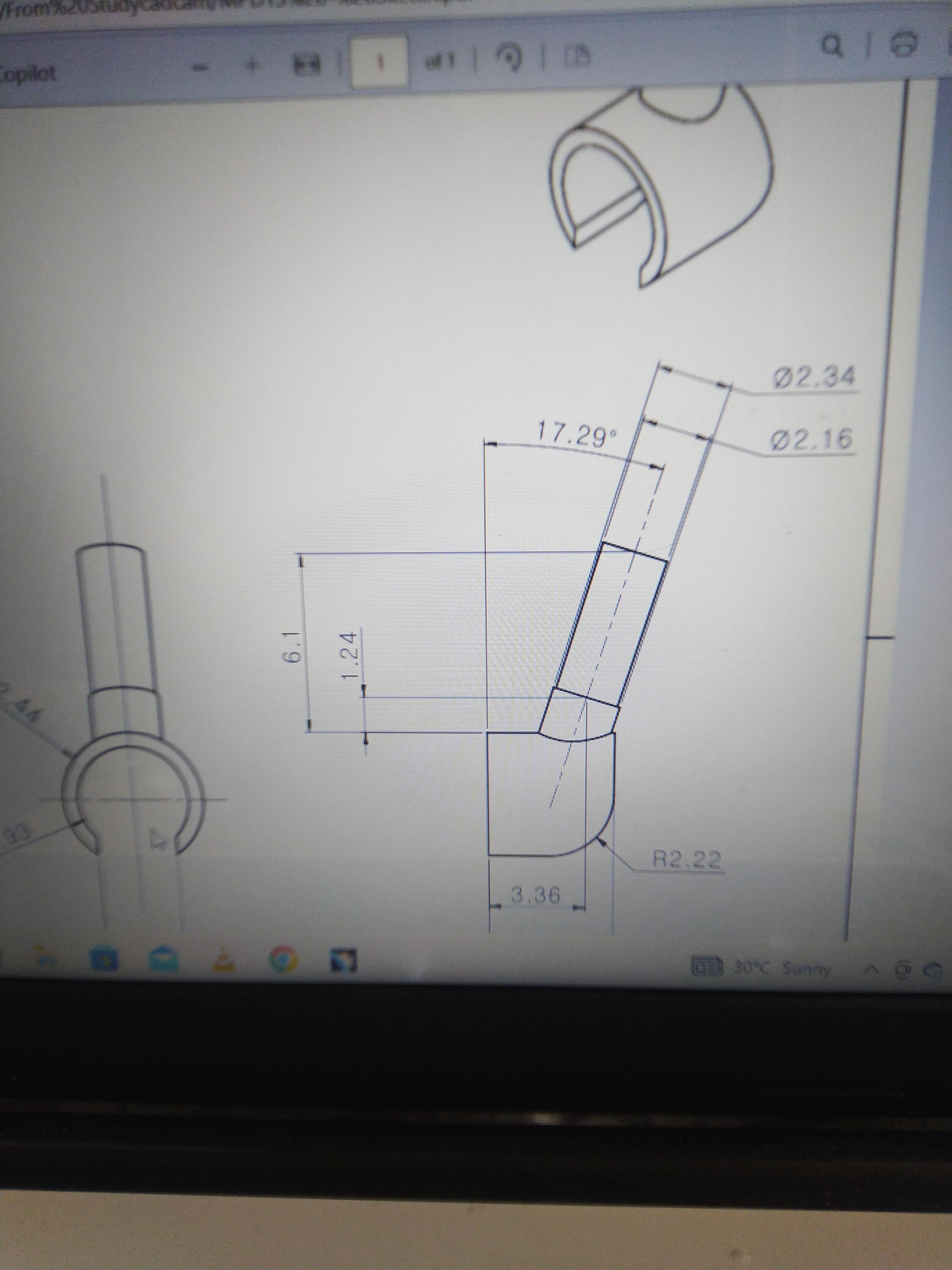 After you make the bottom R44 piece, make a sketch in the vertical, center plane. There you can draw the 17.29° centerline based on the 3.36 and 1.24 dimensions.