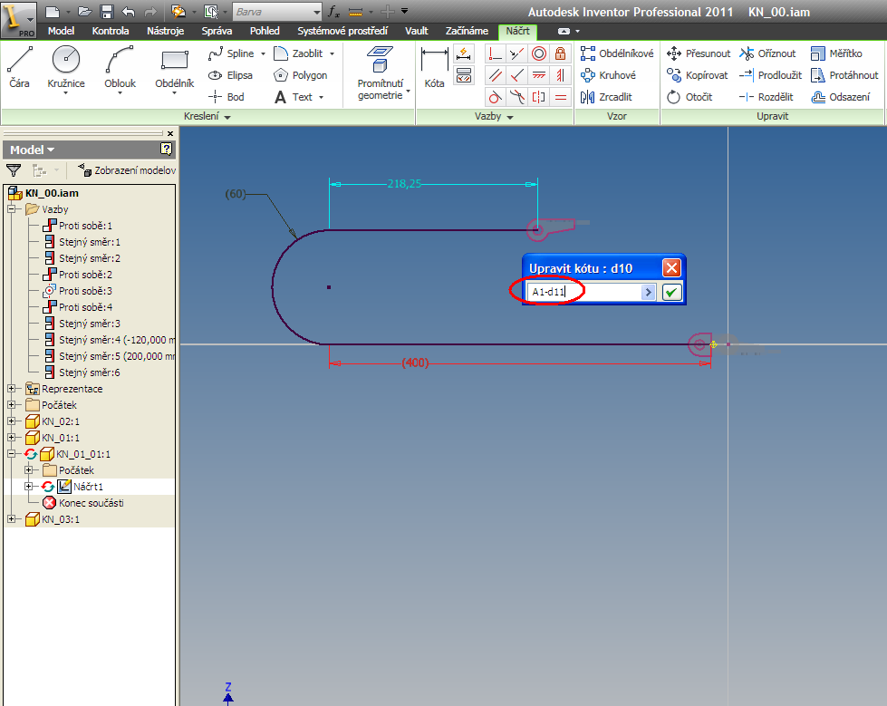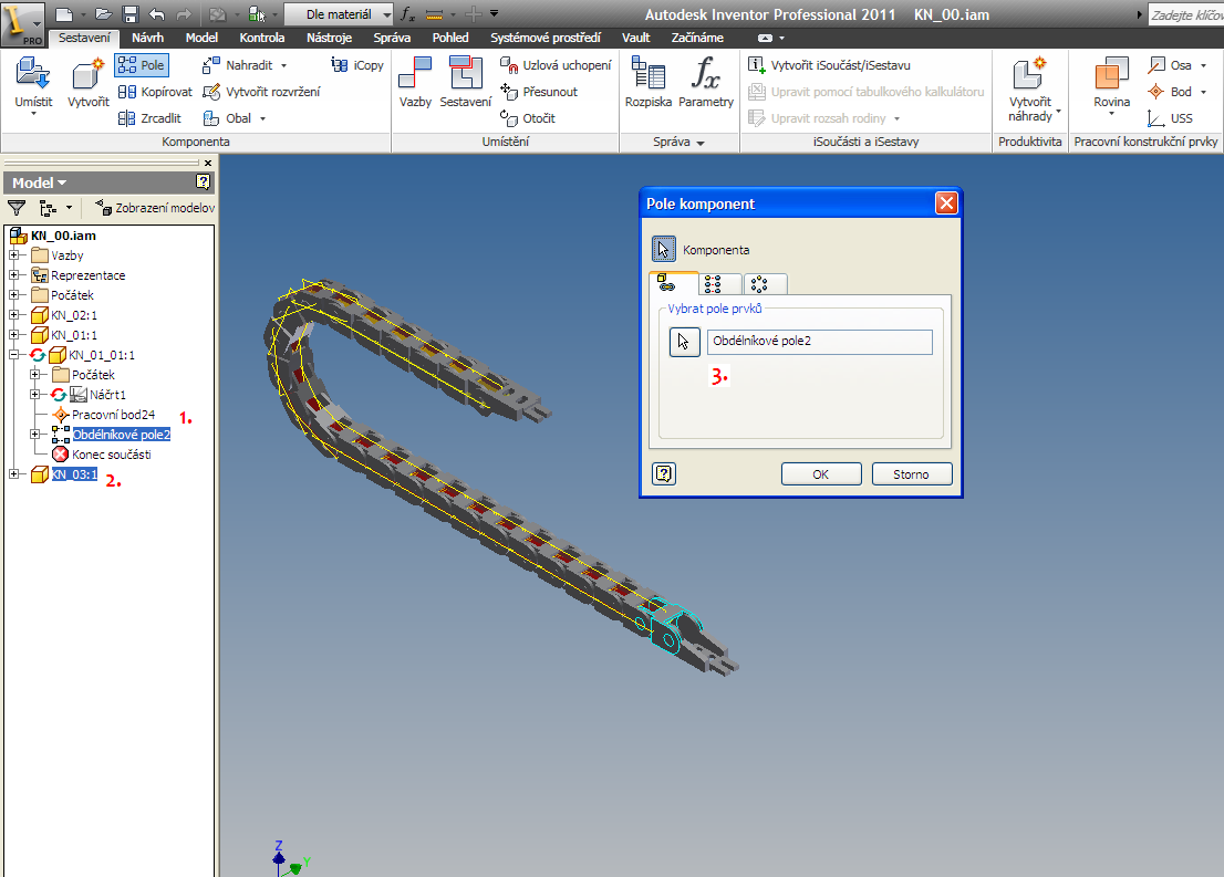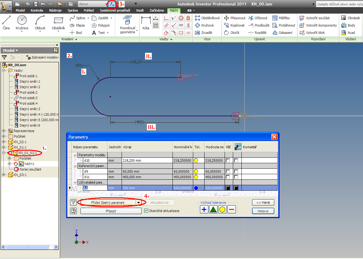 The necessary components for creating a chain can be drawn as a single party or to download grabcad.com . Spacing between components of 31.5 mm. The first article will be anchored to the origin of the coordinate system . The second article (end ) " anchored " in the y-axis symmetrically to the initial cell, the height of the axis of 120 mm and the distance components on the x-axis 200 mm. After that, create a new component ( part) in the XZ plane , which outline the trajectory of the chain. Use the Project Geometry convert the entity to start and end the article. Here we will outline the aforementioned trajectory. When dimensioning follow the procedure shown in Figure 1 ( Roman numerals ) . The next step will be the definition of the parameter A1 (500 mm) , which we will use in the next step .