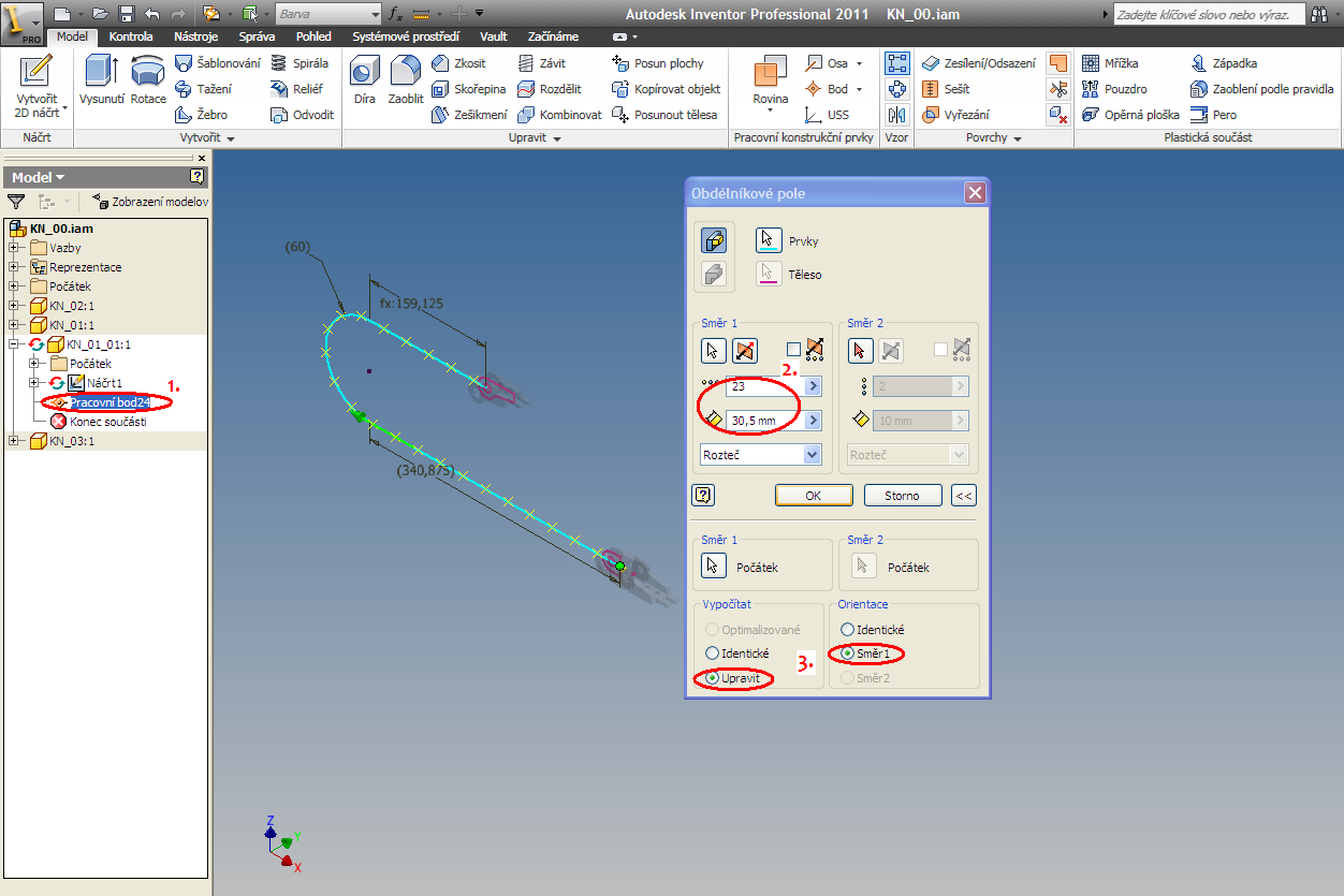 With a rectangular box will create a set of points leading the path created in the previous step. This field will define the spacing between components to 31.5 mm and the number of points on the 23rd Do not forget Orientation - > Heading 1 and Calculate - > Edit ! ( Image. 3 )