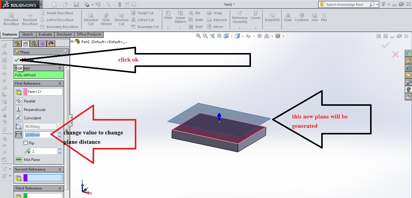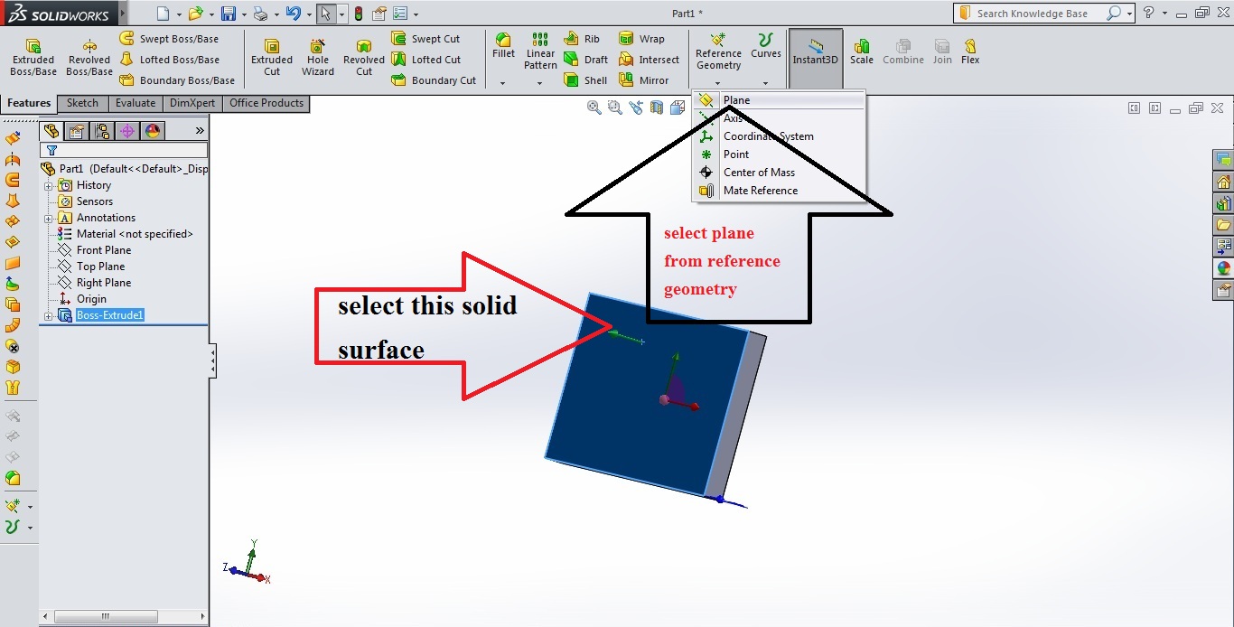 open solidworks part file....select any plane(tpo.front or right)......draw something on this plane,click edit sketch,go to reference geometry....then click for a new plane