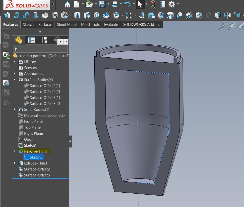 this is the tutorial example in solidworks. Even though i followed the instructions I am unable to create shell with the thickness of 3 mm . can anyone help with this?