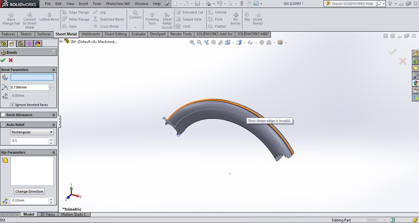 I want to flatten a pipe that has non-linear edge. In linear pipe, I easily use "insert bends" then with "flatten" create my model. But in non-linear, when I use the "insert bend" command in sheet metal part, an error appears that "non-linear edge is invalid". Does anyone have any idea to solve this problem?