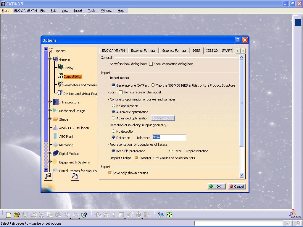 2.Tools-->Options-->General-->Compatibility-->IGES-->Representation Mode-->Activate Sold-Shell instead of Surface or B-Spline