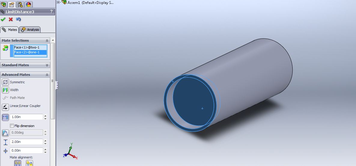 In the picture, there is a long extruded rectangle and a slim one on top of it. In the assembly mode it is easy to mate the slimmer one to move on the long one. How to limit the movement so that the slimmer one would not move beyond the faces of the longer one but still move freely in between them?