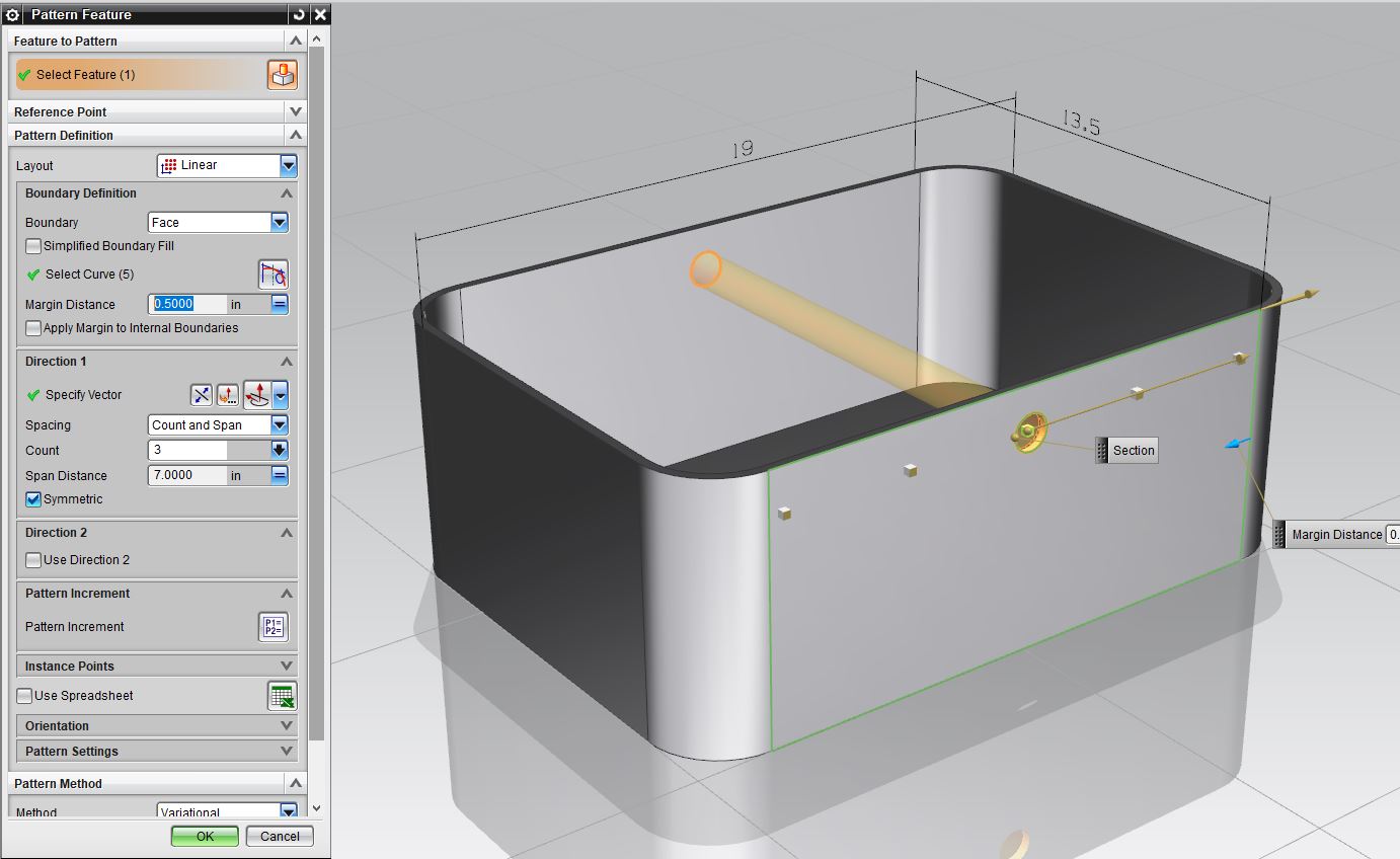 How to make a pattern feature of multiple holes on a rectangular box? Till i get the answer, i will probably do it in a longer way, by sketching on other side too. But short method would be appreciated..