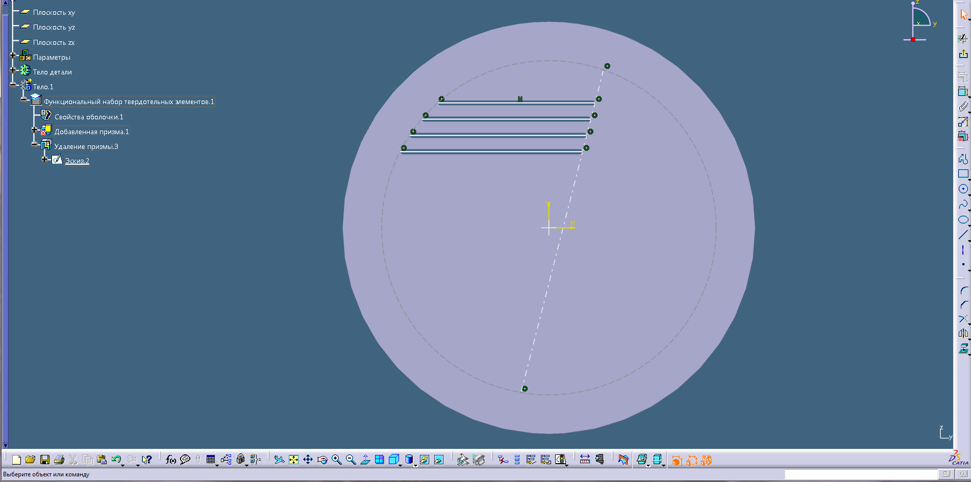 I've done the metinoned cuts (please see the attachment) in NX11 but each profile was manually snapped to both circle and the line. It was a real pain. Now i need to model the same cuts in CATIA. Is there any proper way to perfrom it bby arrays and snaps? One more thing that the diameter of the circle and the anle of the line may change.