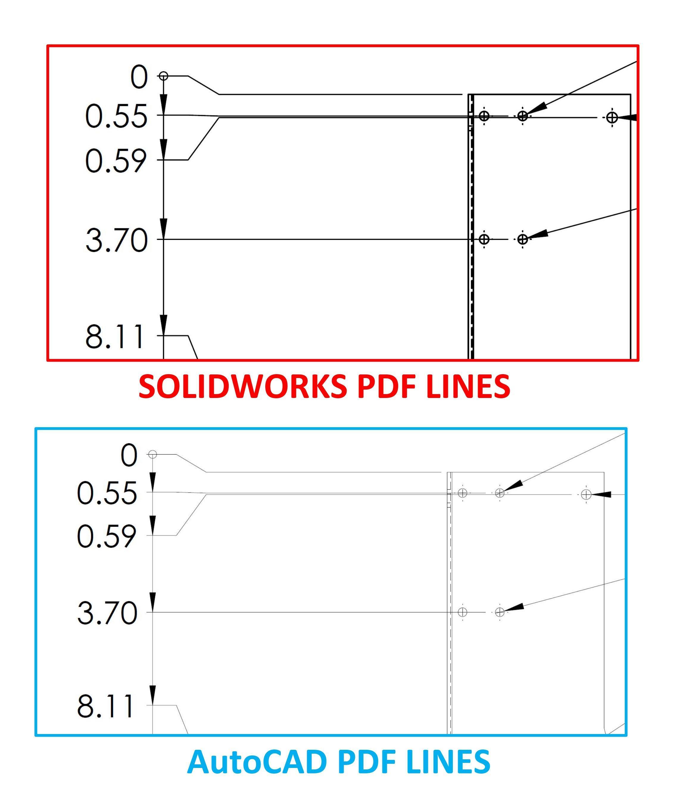 When we create PDFs of drawings from SolidWorks, the generated PDF line thickness appears too thick. However, the same drawing PDF generated from AutoCAD has good line thickness.