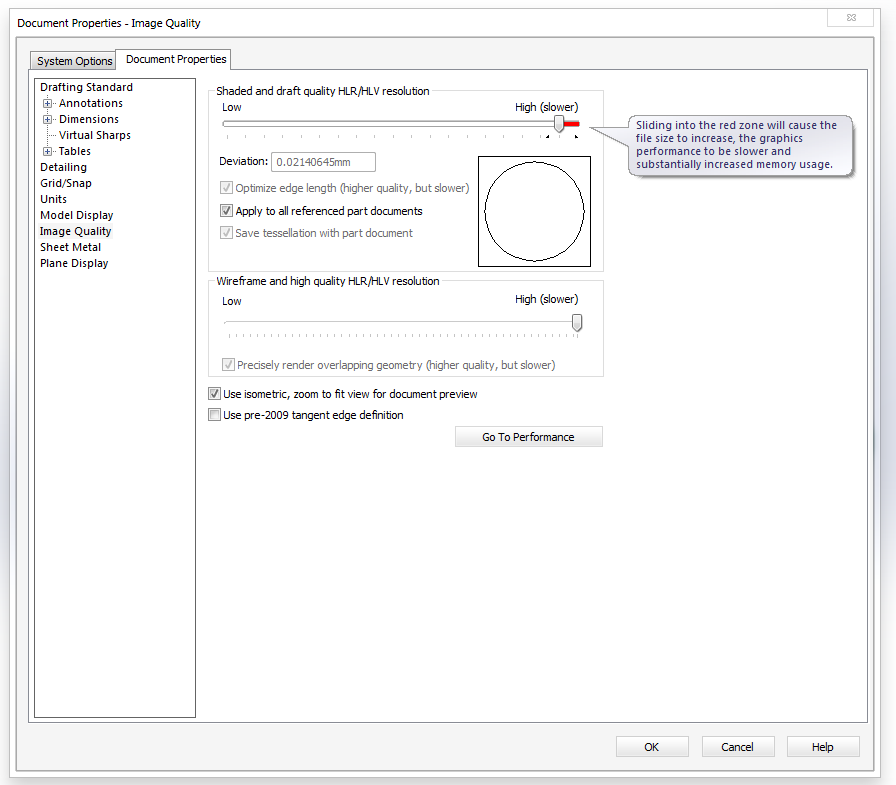 The "wireframe and high quality HLR/HLV resolution" can also be set lower, but I never experienced more or less lag with this option.