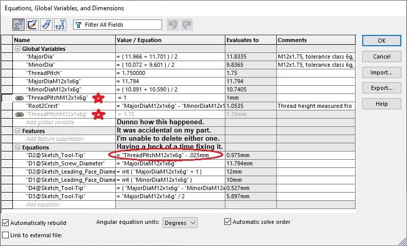 Somehow there is a global variable of the same name. Each has a different value assigned. Neither can be deleted. This, of course, is a problem. Both appear to be linked. One is "grayed out". The other is not. CTRL-Q does not reveal an error condition.