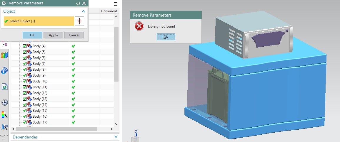 i am using nx 10 software on my laptop.whenever i am using remove parameters on my model.its show library not found.and ctrl j commond is not working on my software.nx reinstall is a last option from my side.please if you have any other method or clue.than please let me know.