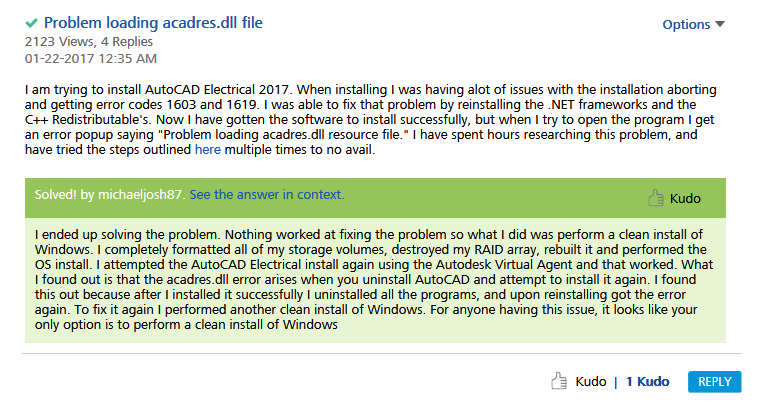 I'm unable to open AutoCAD 2017 Student version in my laptop. It is clearly denying to open it and just says that "Problem loading acadres.dll resource file".