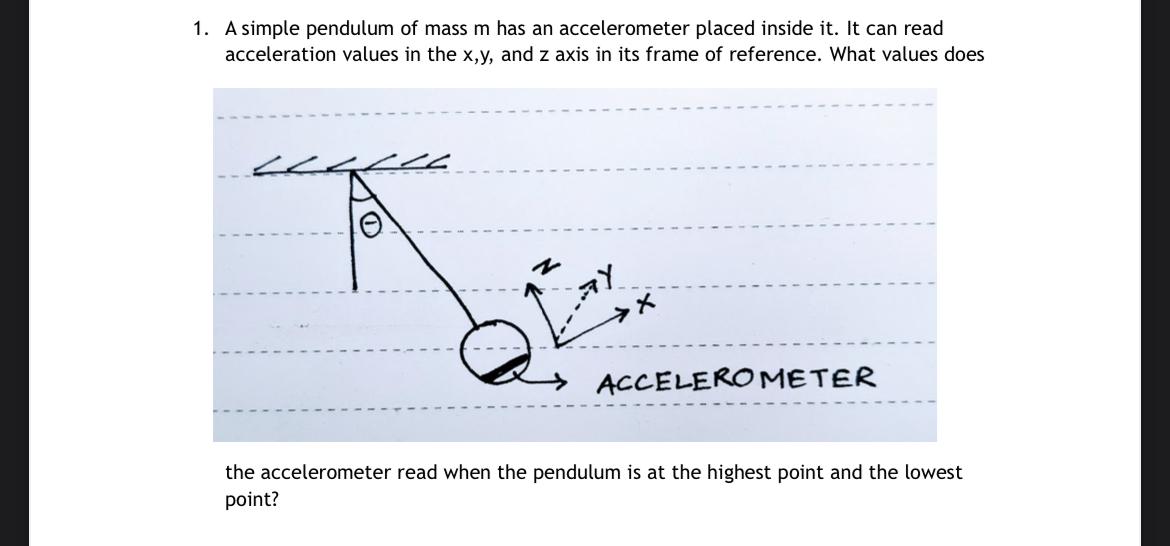 Asimplependulumofmassmhasanaccelerometerplacedinsideit.Itcanread acceleration values in the x,y, and z axis in its frame of reference. What values does