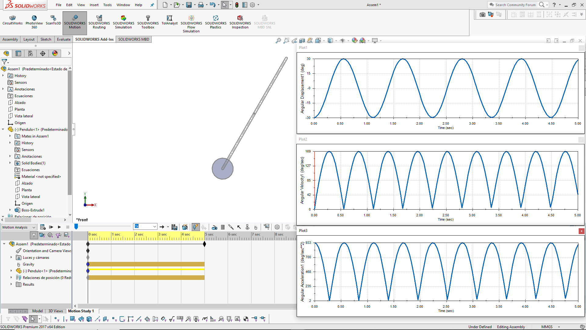 I bring you a schematic pendulum drawn in SolidWorks 2017 mounted in an assembly to be able to simulate it with Motion. One of the great advantages of Motion is that it allows you to graph positions, velocities, accelerations, forces, etc.