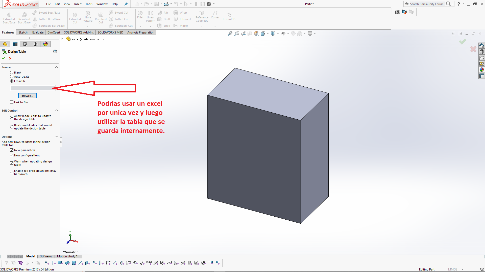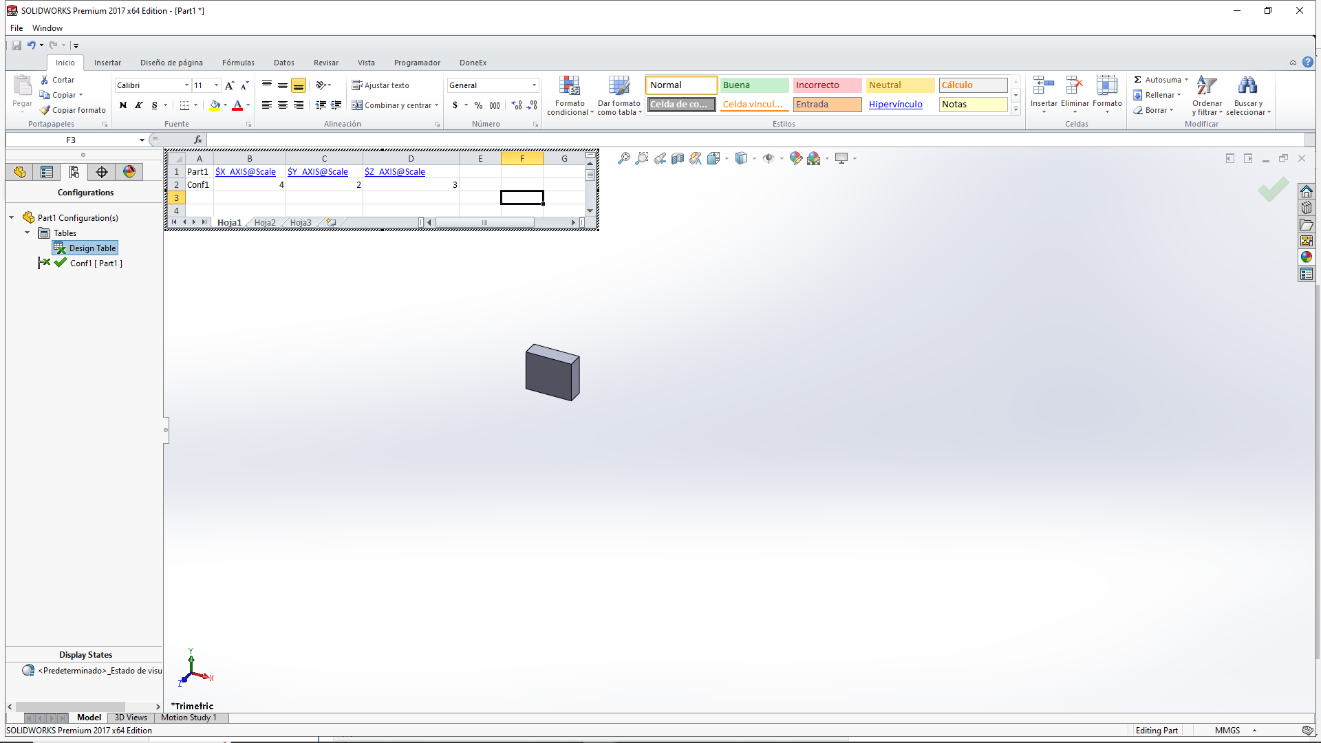 Yo tampoco tengo Excel instalado y funcionando con SolidWorks pero este método me funciona perfectamente. En el menú de configuraciones abres la tabla de diseño (se abre en la pantalla de dibujo) y allí puedes editarla a tu gusto. Al cerrarla, se aplican los valores (de escalas en X, Y, Z) en este caso a la pieza.