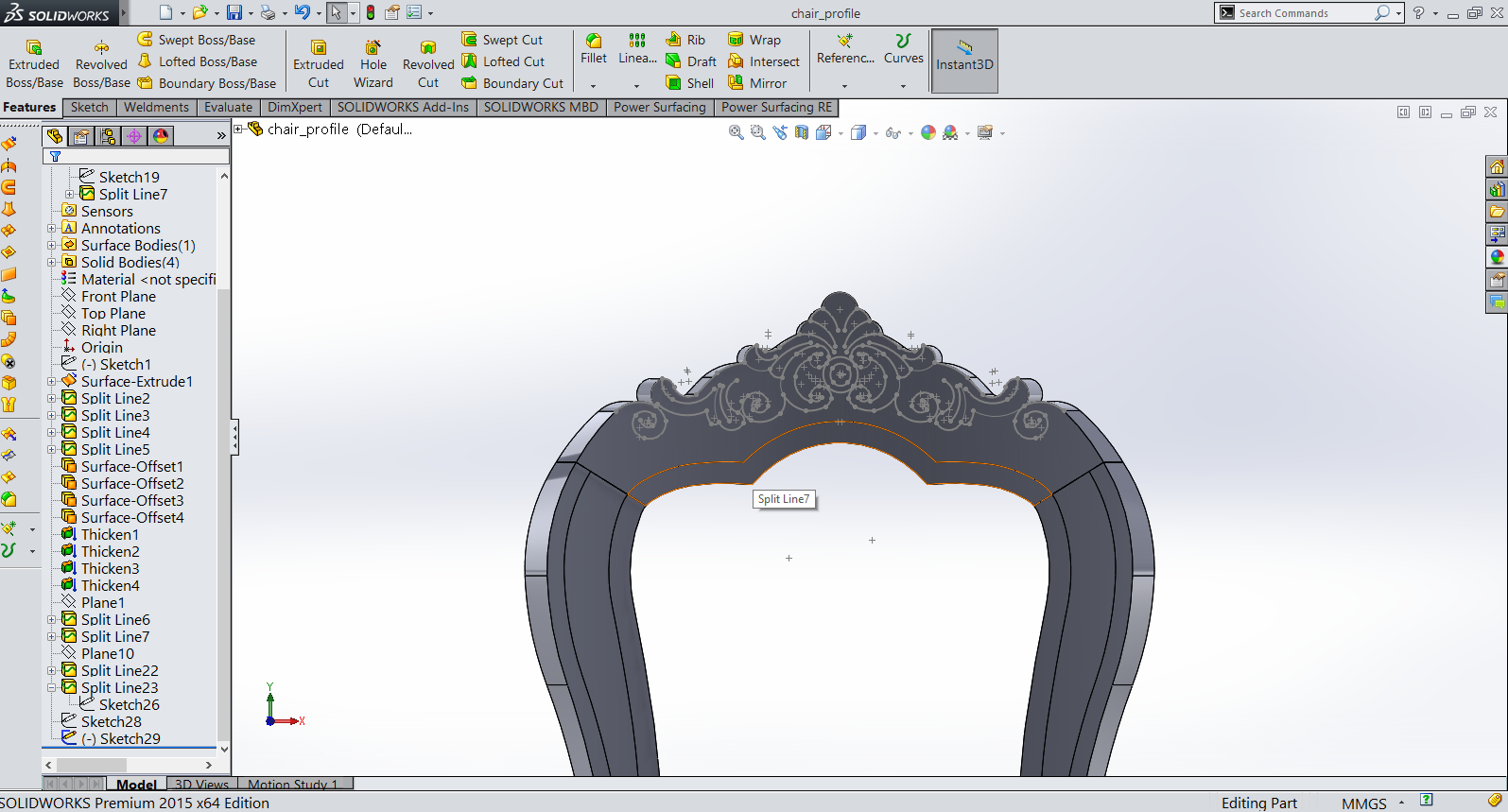 Hello, i have the profile of this chair and i am trying to apply the split line feature or the project curve feature on it, based on 2d drawing imported from autocad. But i have a problem on how to aproch this feature in this situation, can someone help, please? thank you
