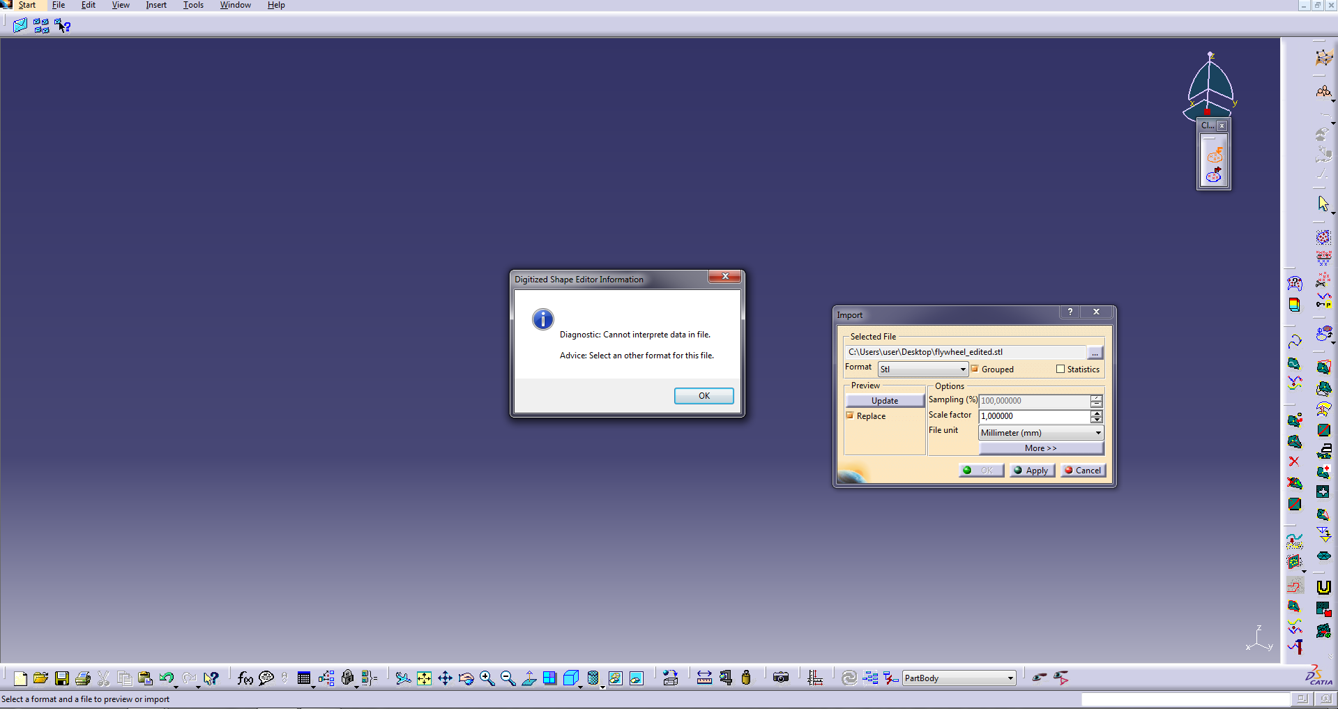 Hello every body. I can not import stl file to CATIA. Can some one explain? I have attached photo below.