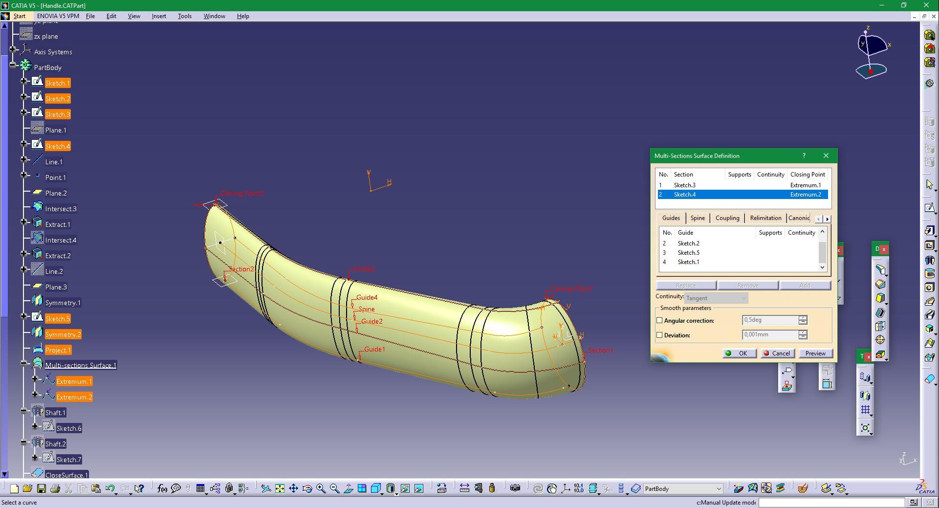 This gives me 4 guides, 1 spine, 2 sections to follow.