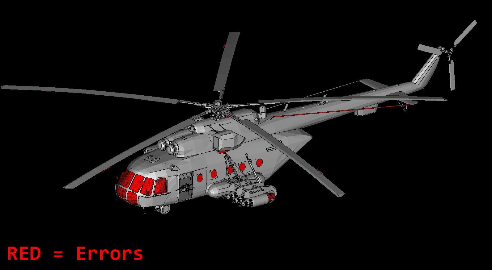 One of the issues with the helicopter model is that there are a large number of errors in it. These inverted surfaces, duplicate faces, holes and other defects need to first be repaired. Files created in programs like 3D Studio often have these types of errors.
