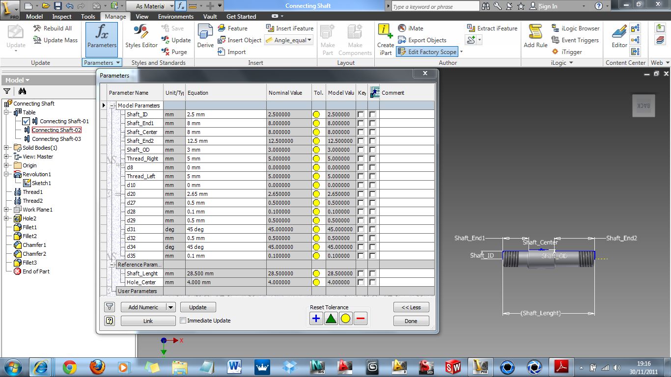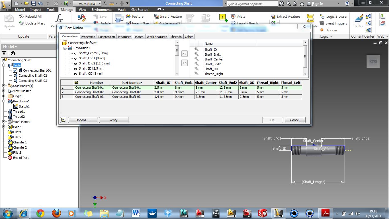 when I want to turn the shaft in to a smaller shaft through the use of I-Parts I am getting an error with the thread being the wrong size. I don't know if I will need to do anything with the parameters of the model for this to work right without the error appearing any help would be very much appreciated. I have added a few screen shots on the model and the problem when it occurs. Thank you in advance for any help with this matter.