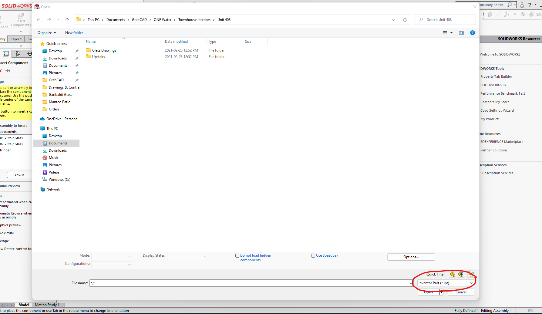 In Solidworks, when I try to insert a part into an assembly, why is the default file type set to "Inventor Part (*.itp)"?