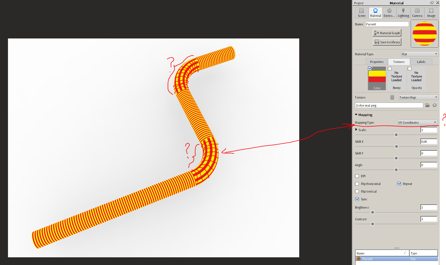 Please help me! How can i set texture mapping in Keyshot so that the stripes are perpendicular to the curve pipe axis. (In the pipe bend texture are parallel)