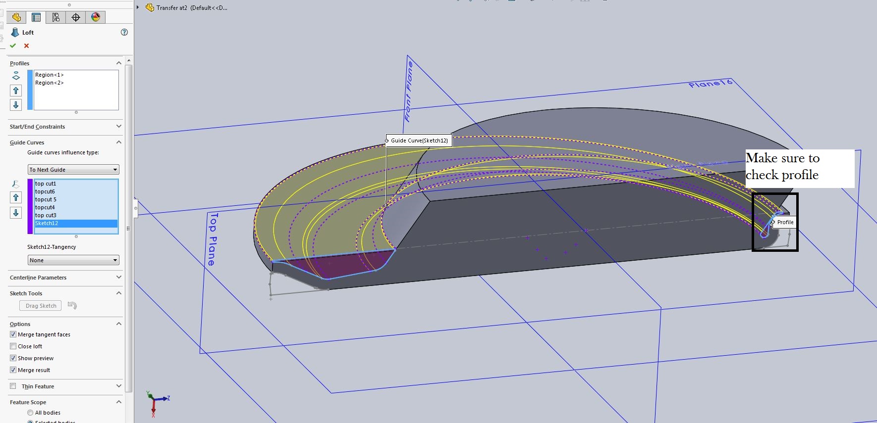 2. Guide curves don't "have" to line up with vertices in the profiles, but that is how it is normally done.