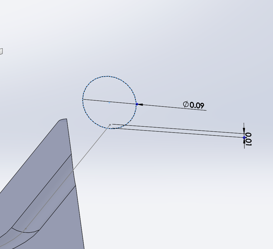 Cut to 1/5 of the whole part, offset for path, use path to start a new plane, draw a circle on new plane, set to proper dimension then swept cut.