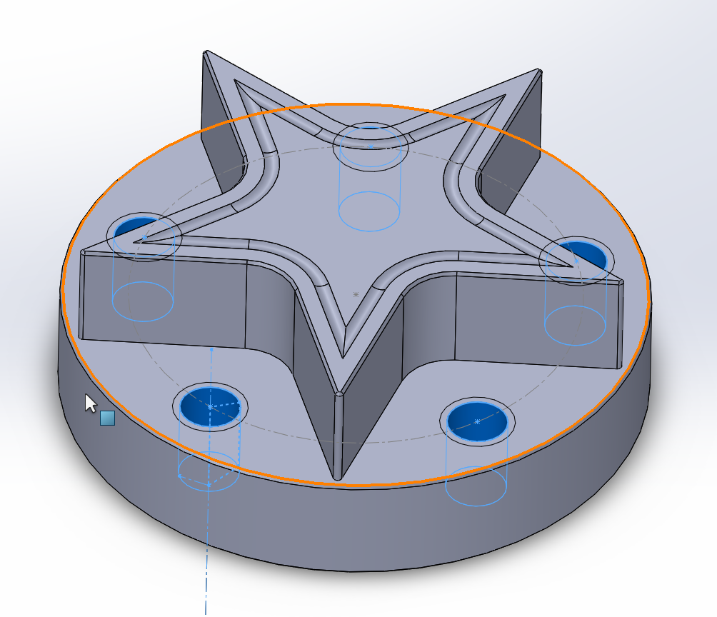 Circular pattern the other 4 bodies, combine, draw a circle and dimension it, place a point on circle and under the origin and set vertical relationship, circular pattern this point for reference on hole wizzard, hole wizzard.