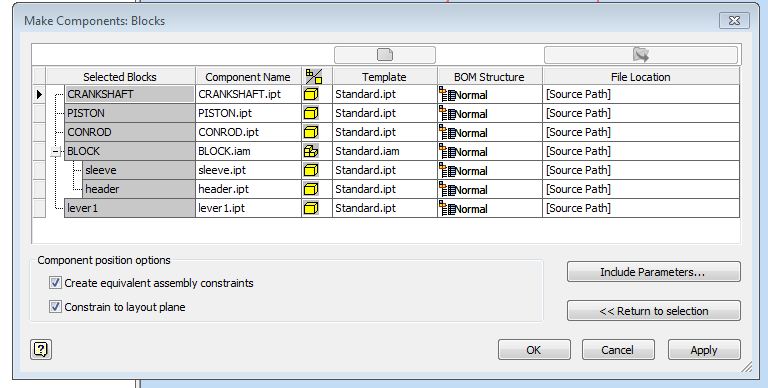 So, to answer your question 1)… group the lines in block and rename them. Separate sketches for the sub-assemblies – but will create ONE assembly with all of the part in. You will have to demote the parts into sub-assemblies… and constrain them.