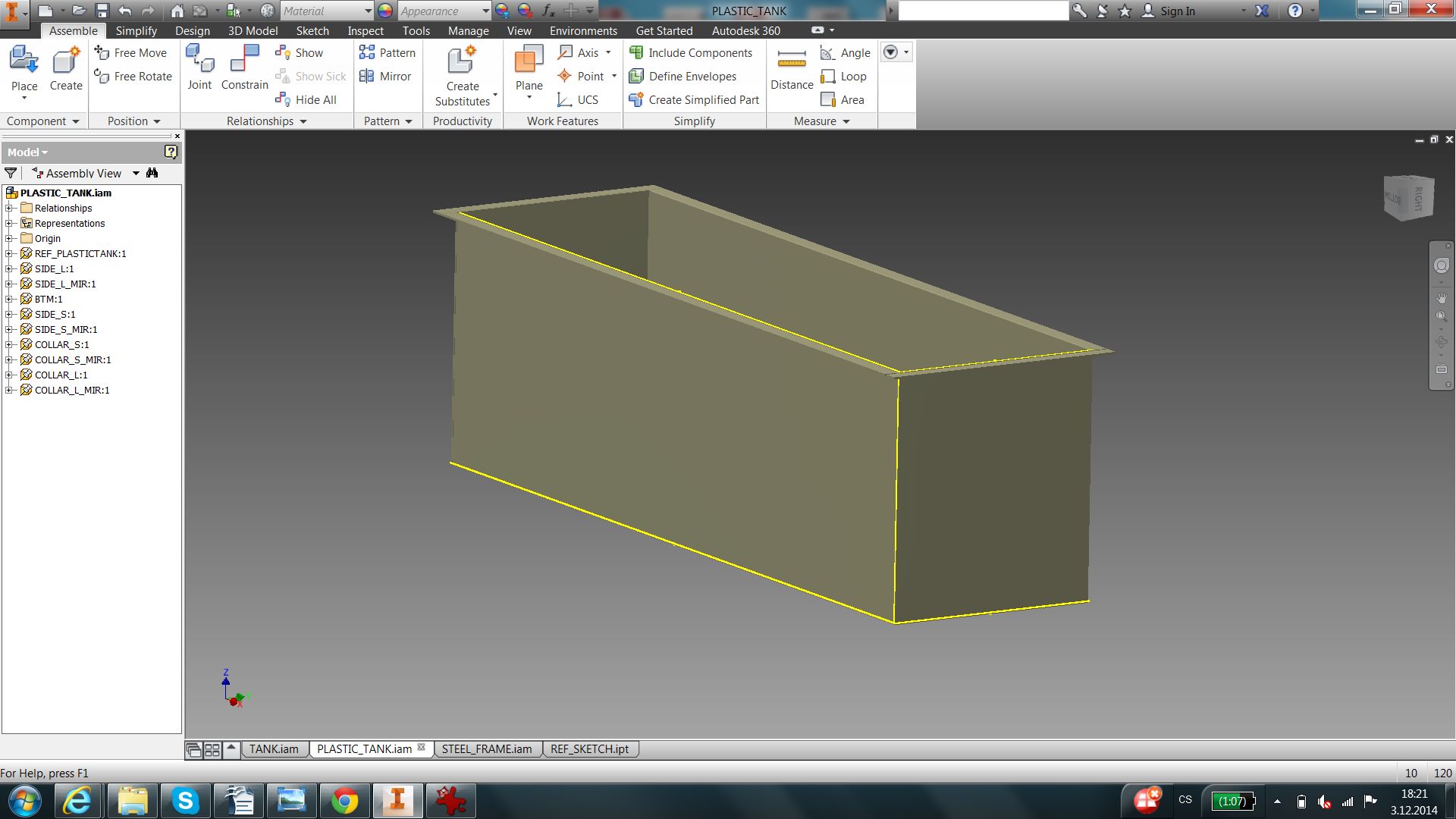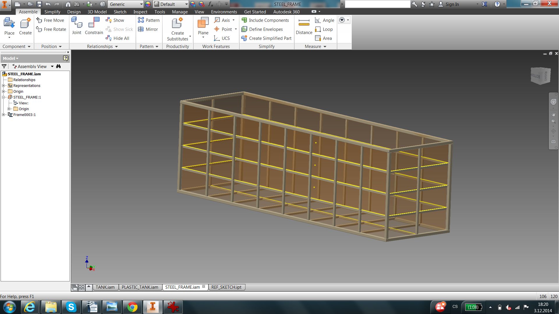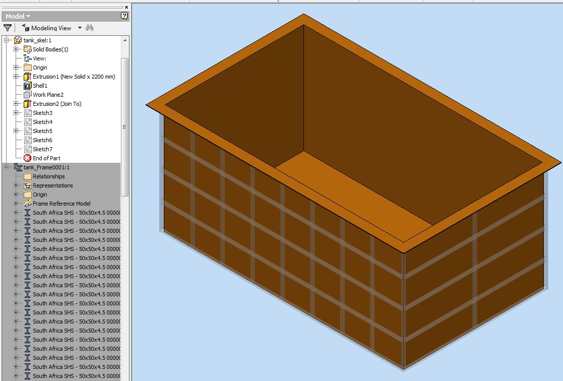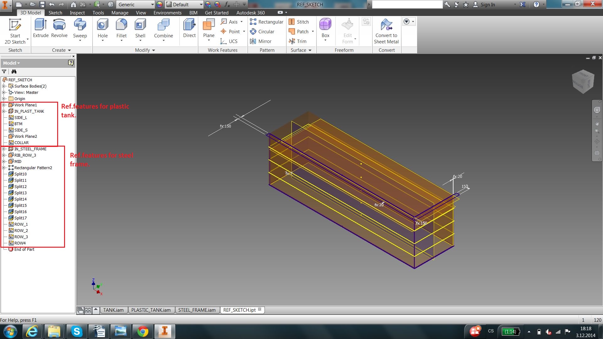 For your tank: The part file that will become the skeleton for the frame-gen assy may have solids in = the plastic tank itself. then I draw sketches on the faces and project the points/lines to the other faces so they line up. The split features in your sketch could be replaced with workplane-sketch-project cut edges to give you the sketchlines for that level.