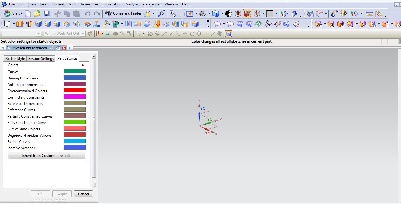 nx user question aea7f2fa 21 Mar, 2015 01:49 AM how do i set my sketch colors and other preferences permanently i tried customer defaults but that didnt work thanx 1 Answer 82d936ba Answered on 20 Apr, 2015 09:35 AM Preferences ....Sketch....Part Settings 1.JPG