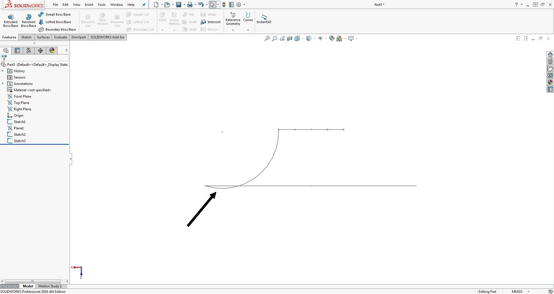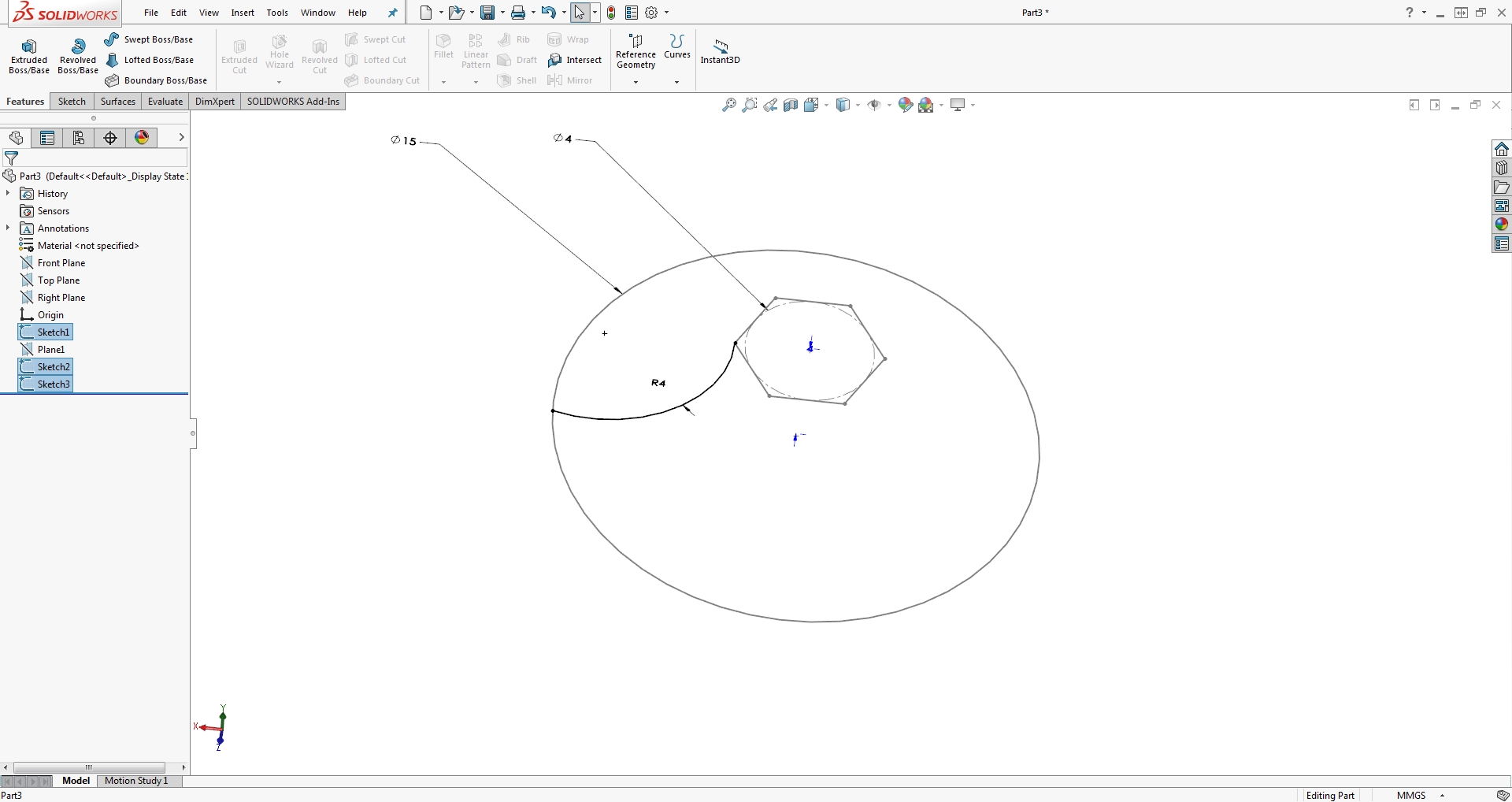 2. Sketch4 is under-defined. It should connect to the the two profile sketches. I'd add tangency constraints as well.