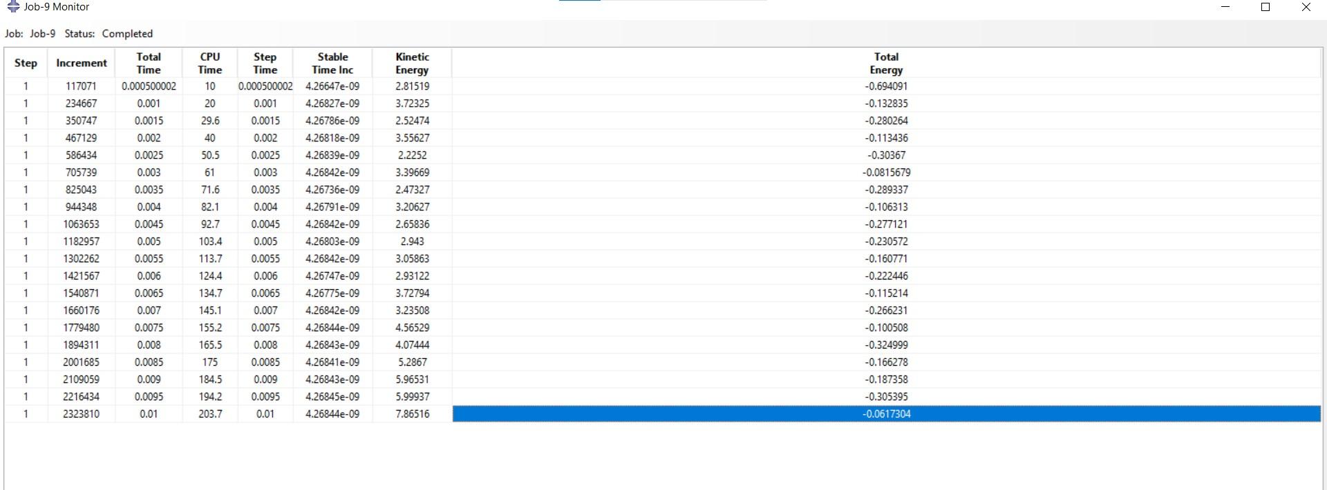 As you can see the total energy is negative and also the kinetic energy is small which means theres no huge deformation as expected..