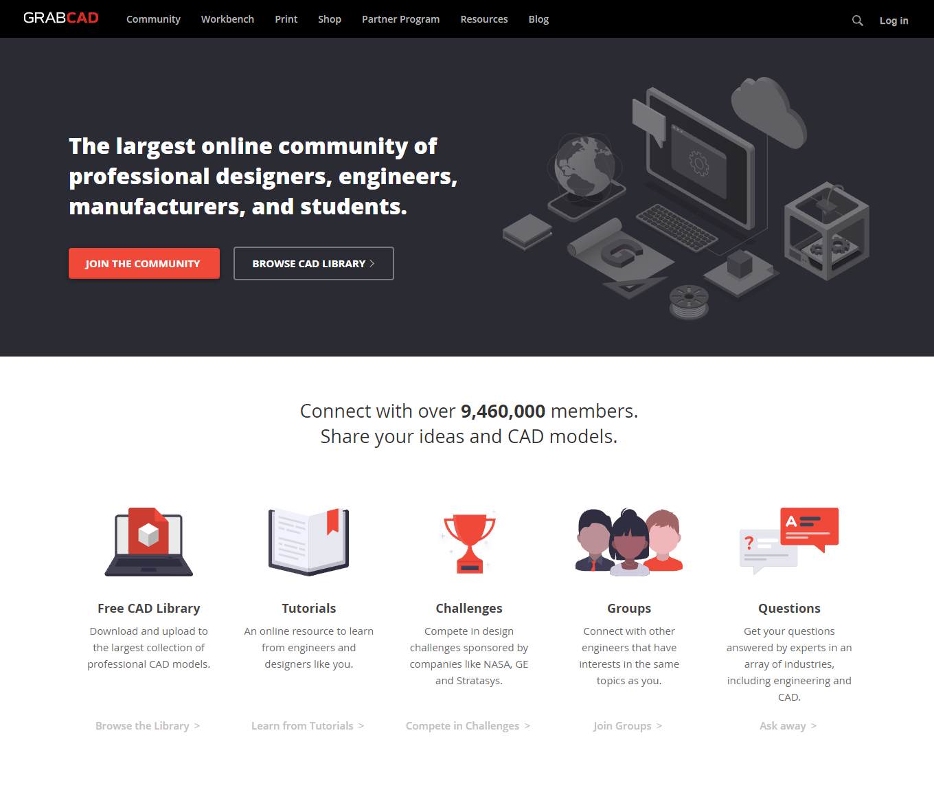 Sign out and you'll find it saying that GrabCAD is "The largest online community of professional designers, engineers, manufacturers, and students", where you can "Connect with over 9,460,000 members" and "Share your ideas and CAD models".