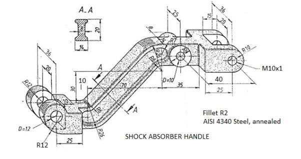 The dimensions on the attached image are not very clear, but I think the angle of the center section is defined with the horizontal distance (70) and vertical distance (30) between the center axis at both ends. To sketch the angular lines, you must first draw the radii at both ends and then add tangent lines between those curves.