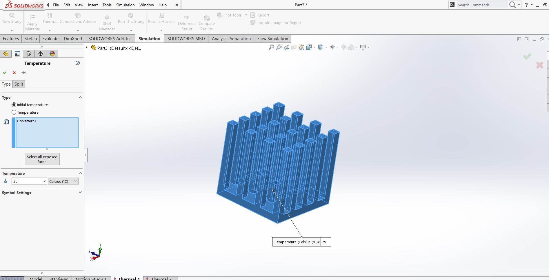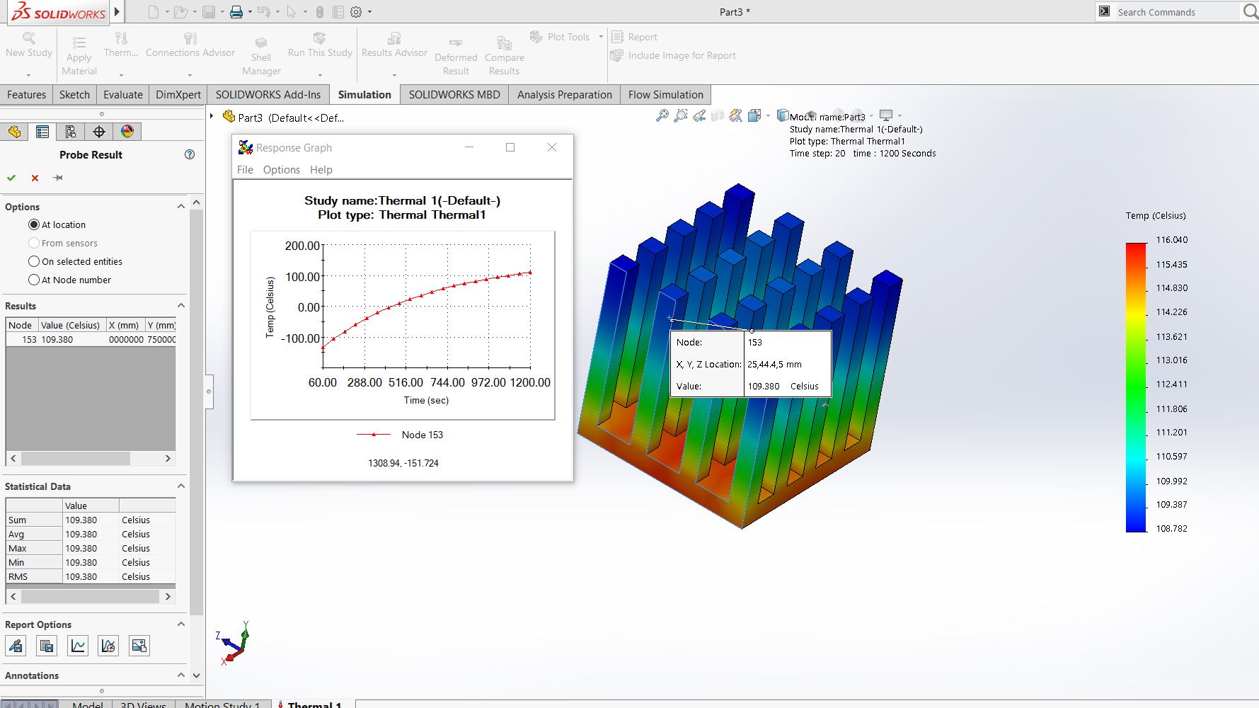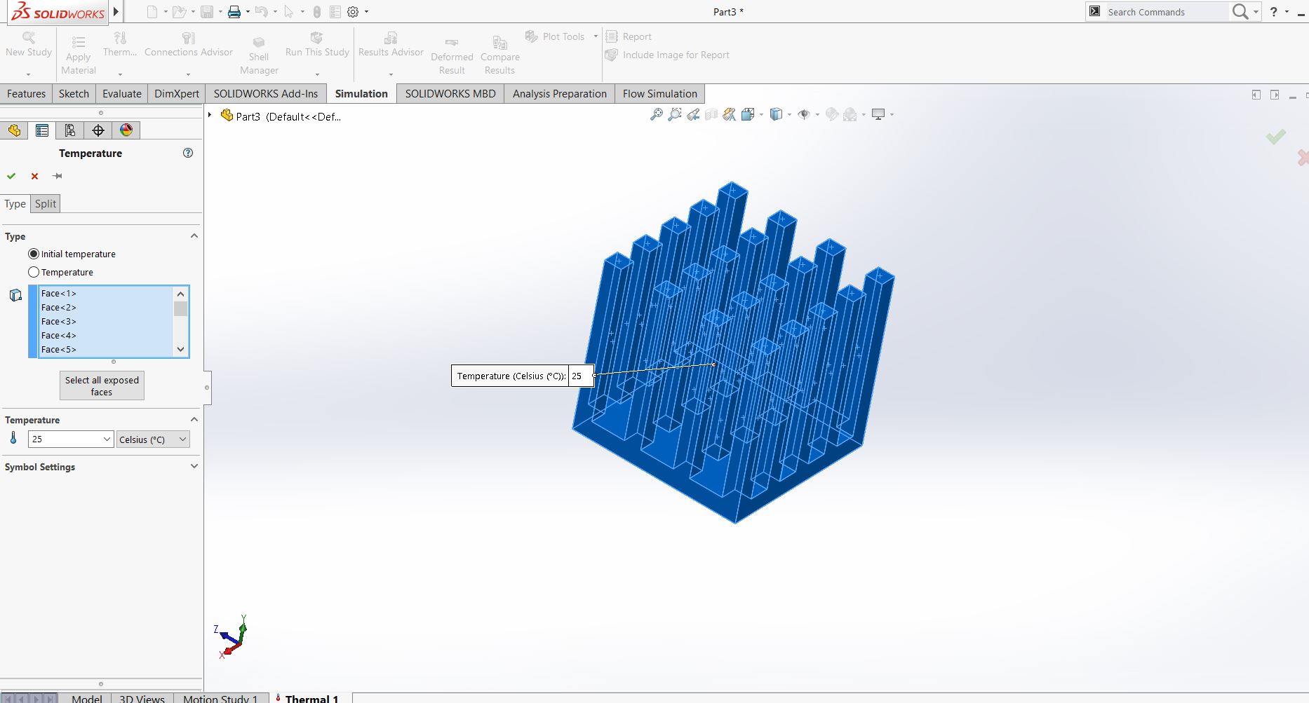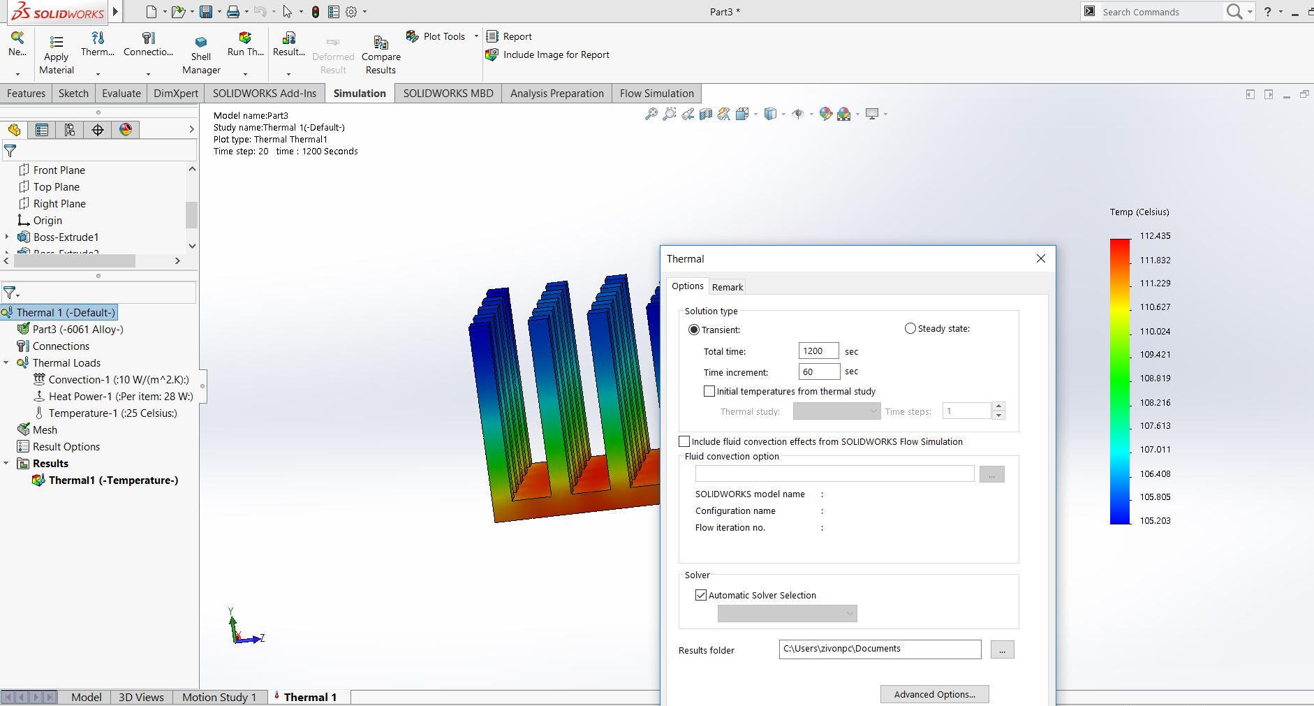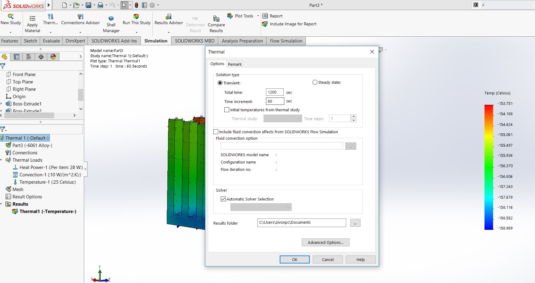 everything is correct... now i restarted solidoworks. did analysis again, and now its showing me different temp then i got last time but far wrong for the tutorial temp.