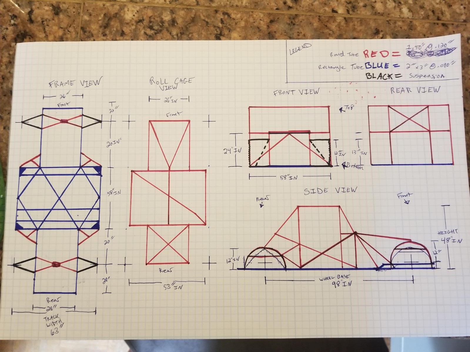 I got a hand sketch of a roll cage ( check attachments) to make a roll cage, which is a simple enough task... if I fully understood how to combine each view to make the intended design. The below is what I currently have (attachments), which is NOT a good roll cage design, so I know the problem is either me or the drawing. What can any of you make from it?