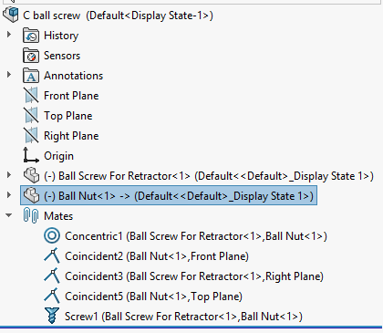 The basic way is to use screw mate. If you are using the ball screw in an assembly you should first have to mate the screw allowing it to have one degree of freedom( rotation along its axis), then you should use concentric mate to align both ball screw and nut in a common axis. Ball nut should also have only one DOF( translation along the common axis) so use necessary mates( parallel/ coincident ). Finally apply screw mate.