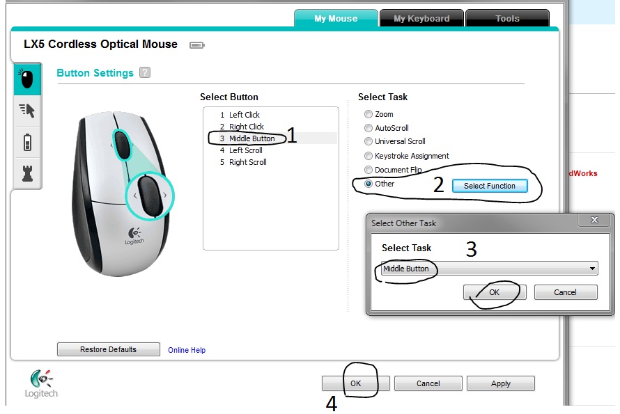 Hello, I am trying to find a setting for enabling third mouse button model rotate in SolidWorks. Am I missing something, or is it a logitech mouseware issue? Thanks!