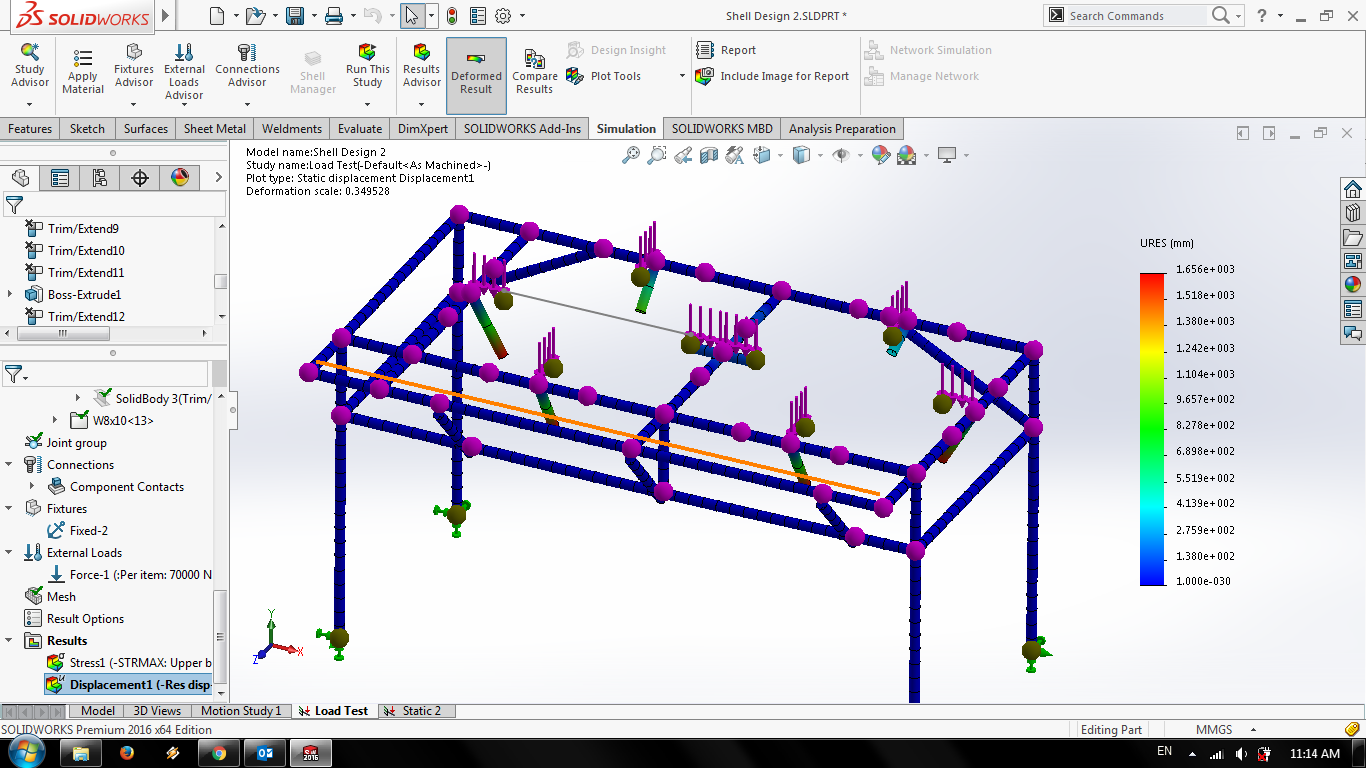 I try to do a force (load mass) simulation using solidwork for a water tank structure. The idea is that the steel structure using beams to support 2 water tank with 5 litre capacity and i`ll be expecting 70kN force at the support beam. The thing that came to the that is the force applying 70kN onto every support or it divided on every support?