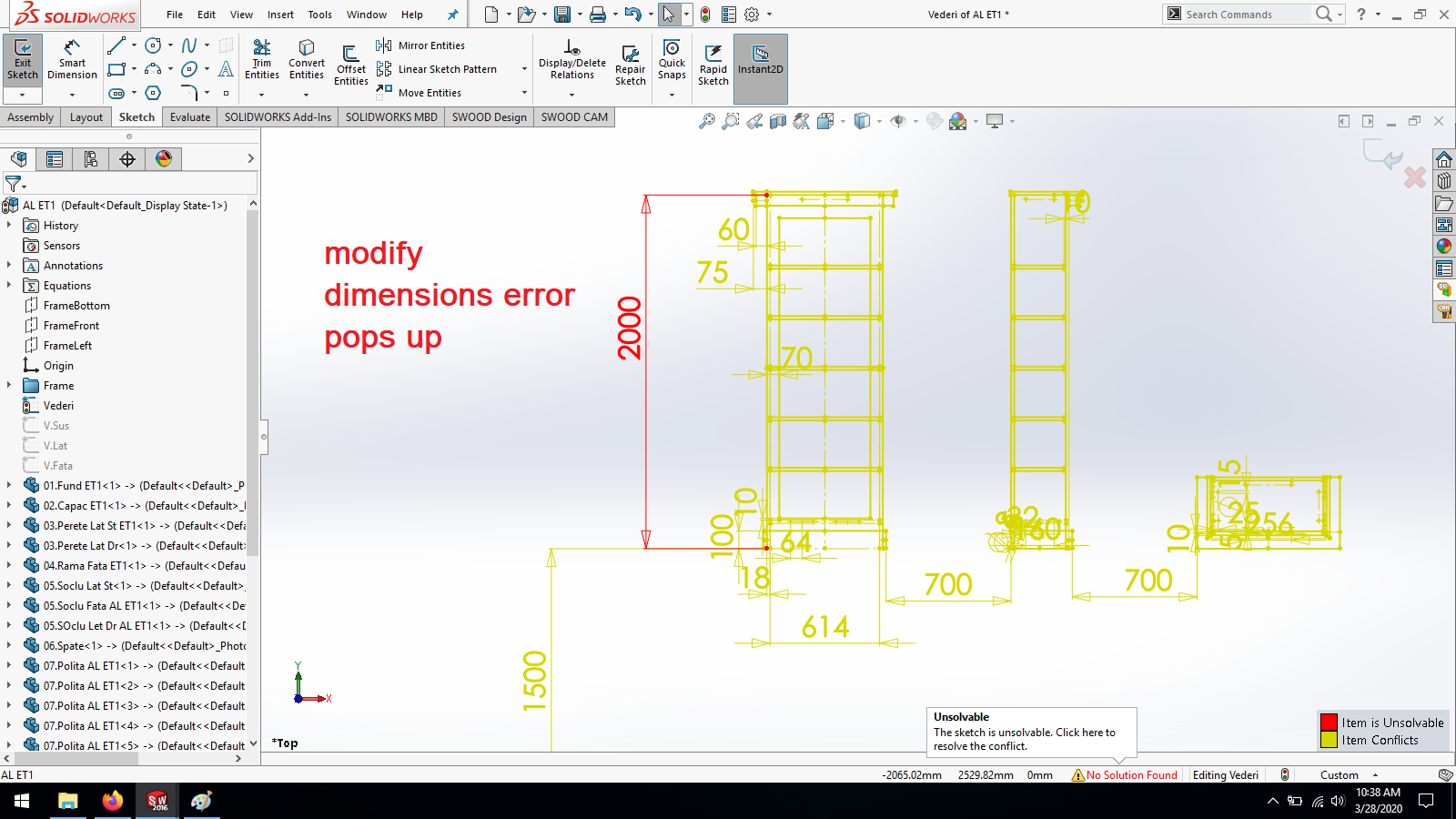 In solidworks i have a fully defined sketch, and i still can add black dimensions on,not grey dimensions, whitout getting the error window pop up,but when i try to modify the dimensions the error window pops up. this is unseen, from my experience. thank you