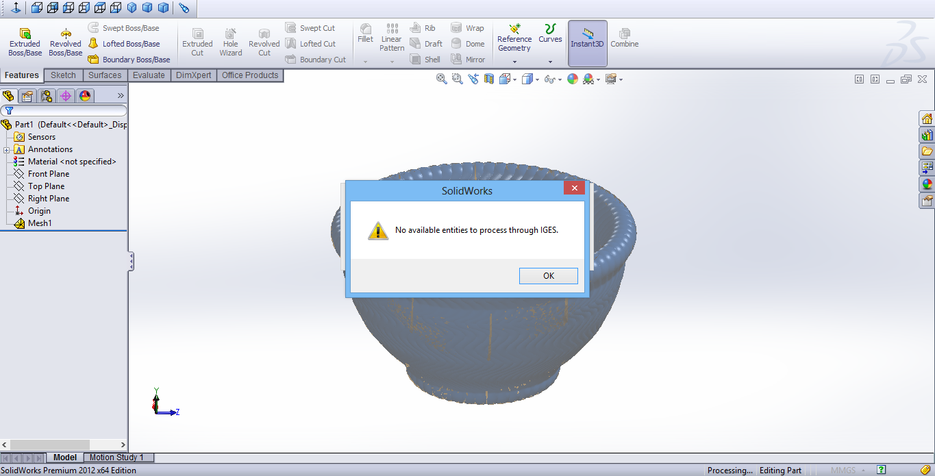 i've this obj file i want to convert it into step file inside solidworks. any ideas?i've used add in "SCAN TO 3D" but when i try to save it it's not happening shows some error message.any suggestions from how to go from this point?