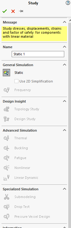 When I try doing FEA analysis with SW Simulation, I am clicking to New Study and everytime only "static" properties is active, other fea methods are deactive, how can i solve this? You can see my error on attach.