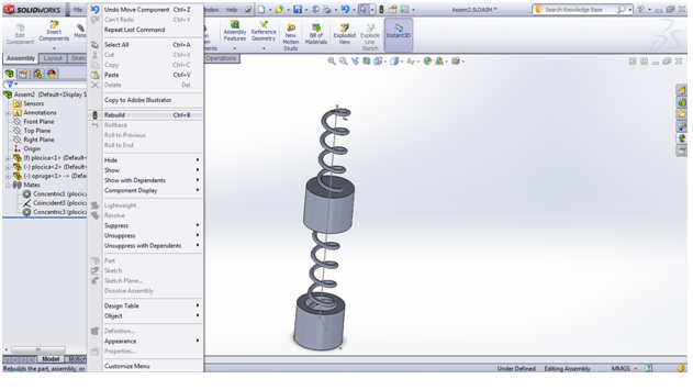 I designed the spring. The spring is connected at both ends on the plates (Mate functions). When I pull the upper plate up or down, the spring does not stretch unless I click on the Rebuilt option. What should I do to make it work without Rebuilt option?