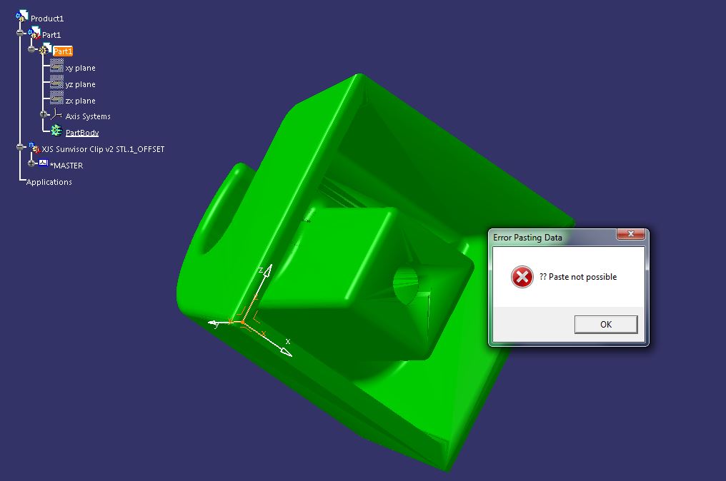 After conversion from .stl file to .model to use it in CATIA V5, i can't copy paste the content of the .model in a new .CATPart.