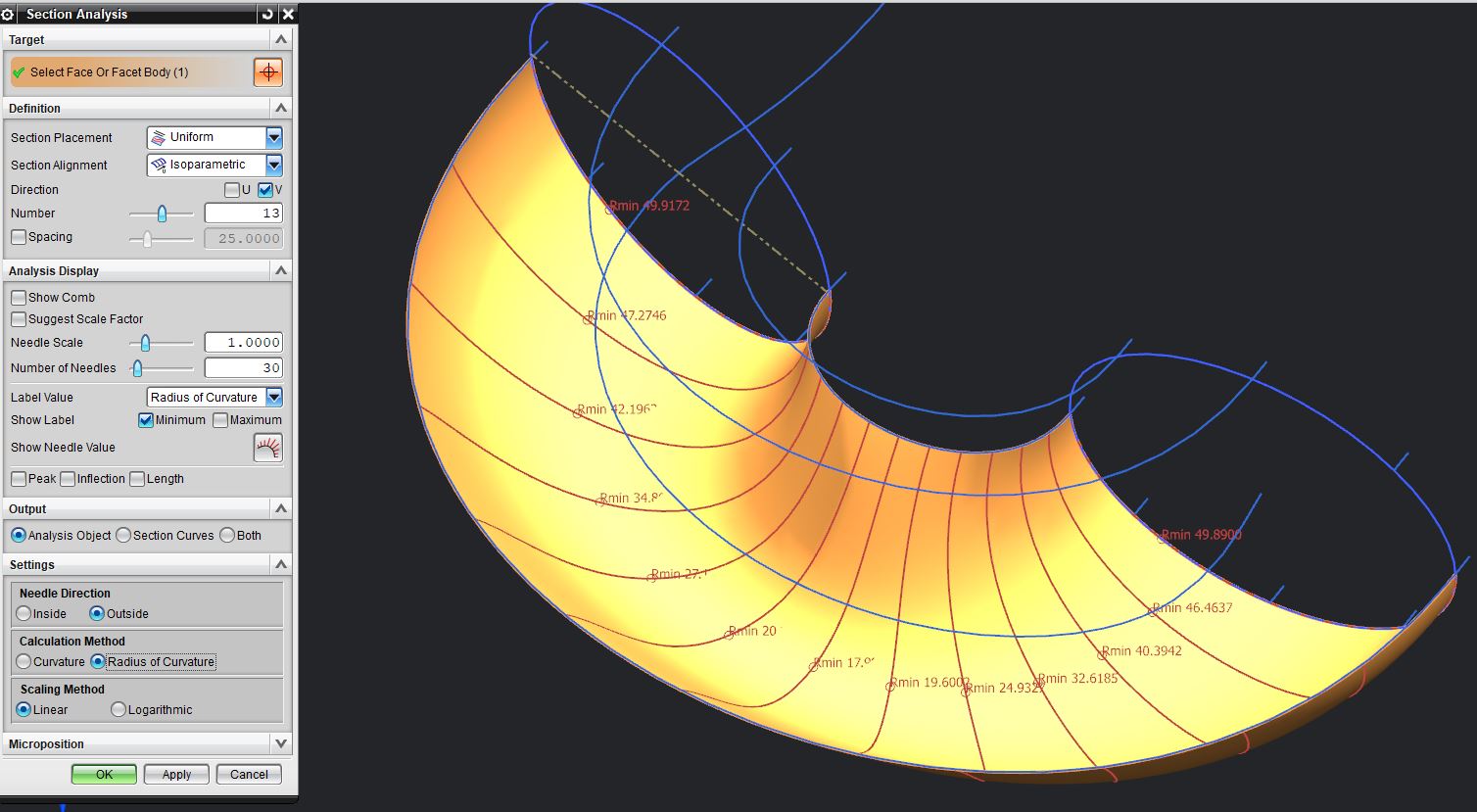 In NX, use the "Section Analysis" tool set to "Radius of Curvature", then decide the definition of the check; isoparam, planes, etc..