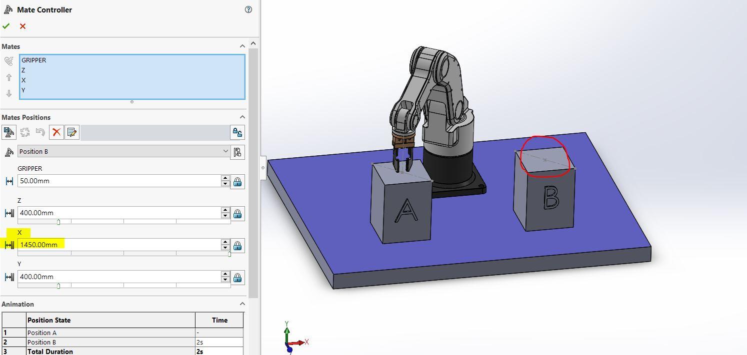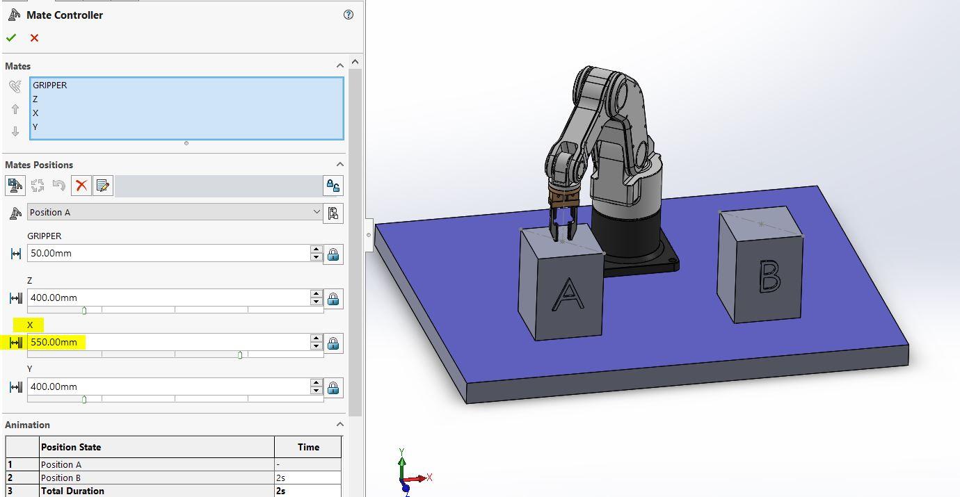 I am trying to use Mate Controller to create several positions of a robot assembly and ultimately create an animation of the robot picking up a block and moving it to another location. I have closely followed the steps set forth from multiple online tutorials but am not having any success. When toggling between the various positions I have created, the 'Limit Distance' mate parameters are correct, but the robot does not visually update positions as it should. See two screenshots from the Mate Controller manager, showing Positions 'A' and 'B', respectively. In this instance the 'X' dimension value varies between 550mm for 'A' and 1450mm for 'B', with no other mates in place to constrain this movement.